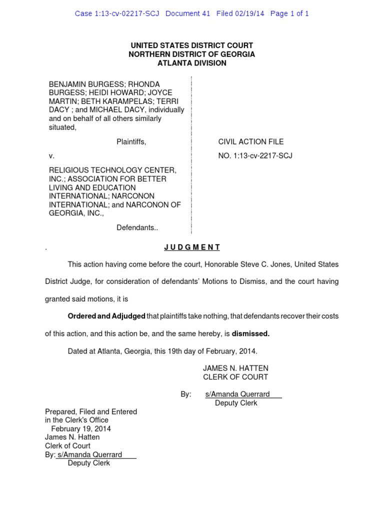 BENJAMIN BURGESS; RHONDABURGESS; HEIDI HOWARD; JOYCEMARTIN; BETH KARAMPELAS; TERRIDACY ; and MICHAEL DACY, individuallyand on behalf of all others similarlysituated, Plaintiffs,CIVIL ACTION FILEv.NO. 1:13-cv-2217-SCJRELIGIOUS TECHNOLOGY CENTER,INC.; ASSOCIATION FOR BETTERLIVING AND EDUCATIONINTERNATIONAL; NARCONONINTERNATIONAL; and NARCONON OFGEORGIA, INC., Defendants...