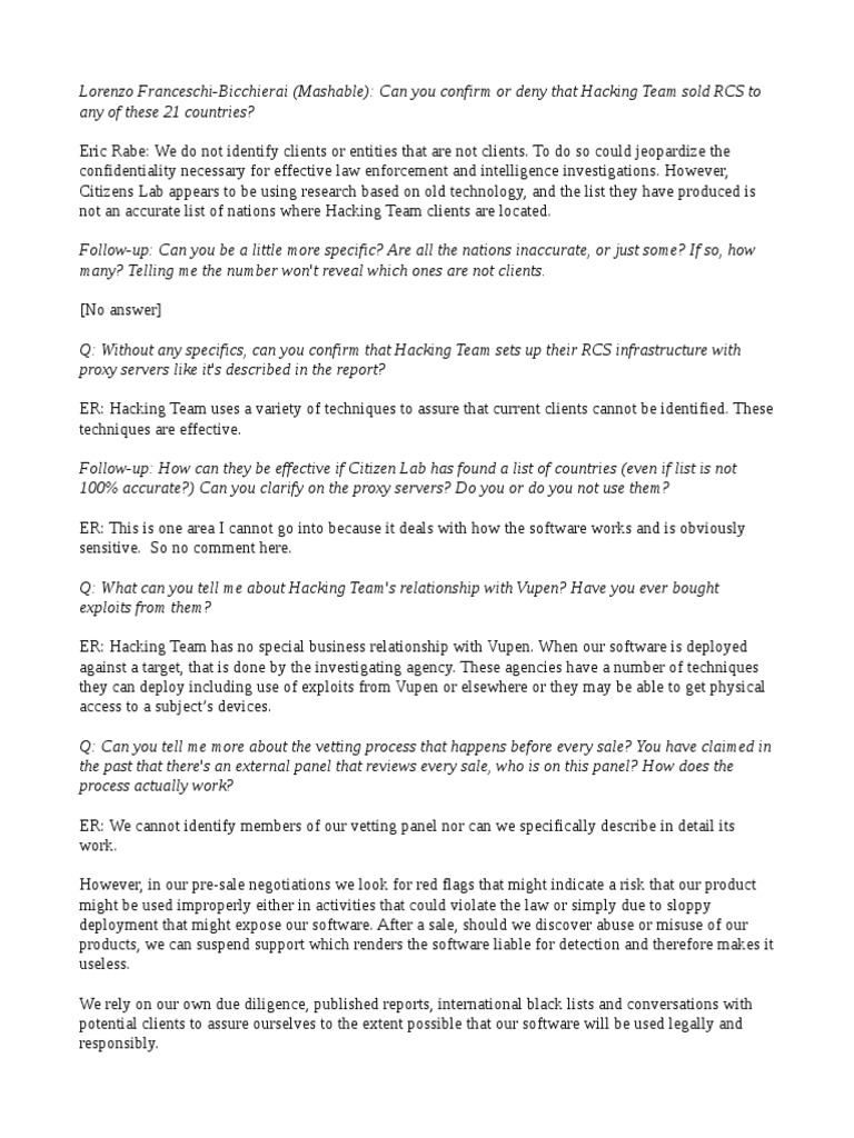 C" to any of these #$ countries% Eric Rabe: We do not identify clients or entities that are not clients. To do so could jeopardize the confidentiality necessary for effective law enforcement and intelligence investigations. However !itizens "ab appears to be using research based on old technology and the list they have produced is not an accurate list of nations where Hac#ing Team clients are located. Follo&-u': Can you be a little more s'ecific% (re all the nations inaccurate) or *ust some% +f so) ho& many% elling me the number &on,t re-eal &hich ones are not clients. $%o answer& /: 0ithout any s'ecifics) can you confirm that Hacking eam sets u' their !C" infrastructure &ith 'ro1y ser-ers like it,s described in the re'ort% ER: Hac#ing Team uses a variety of techni'ues to assure that current clients cannot be identified. These techni'ues are effective. Follo&-u': Ho& can they be effecti-e if Citizen Lab has found a list of countries (e-en if list is not $223 accurate%) Can you clarify on the 'ro1y ser-ers% 4o you or do you not use them% ER: This is one area ( cannot go into because it deals with how the software wor#s and is obviously sensitive. )o no comment here. /: 0hat can you tell me about Hacking eam,s relationshi' &ith 5u'en% Ha-e you e-er bought e1'loits from them% ER: Hac#ing Team has no special business relationship with *upen. When our software is deployed against a target that is done by the investigating agency. These agencies have a number of techni'ues they can deploy including use of e+ploits from *upen or elsewhere or they may be able to get physical access to a subject,s devices. /: Can you tell me more about the -etting 'rocess that ha''ens before e-ery sale% 6ou ha-e claimed in the 'ast that there,s an e1ternal 'anel that re-ie&s e-ery sale) &ho is on this 'anel% Ho& does the 'rocess actually &ork% ER: We cannot identify members of our vetting panel nor can we specifically describe in detail its wor#. However in our pre-sale negotiations we loo# for red flags that might indicate a ris# that our product might be used improperly either in activities that could violate the law or simply due to sloppy deployment that might e+pose our software. .fter a sale should we discover abuse or misuse of our products we can suspend support which renders the software liable for detection and therefore ma#es it useless. We rely on our own due diligence published reports international blac# lists and conversations with potential clients to assure ourselves to the e+tent possible that our software will be used legally and responsibly.