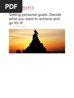 Set performance goals, not outcome goals: /ou should take care to set goals over which you have as much control as possible. 'here is nothing more dispiriting than failing to achieve a personal goal for reasons beyond your control. -f you base your goals on personal performance, then you can keep control over the achievement of your goals and draw satisfaction from them. Set realistic goals: -t is important to set goals that you can achieve. Don2t set goals that can be too high or difficult to achieve. 3onsider your skills and capabilities and then set goals that you can achieve.