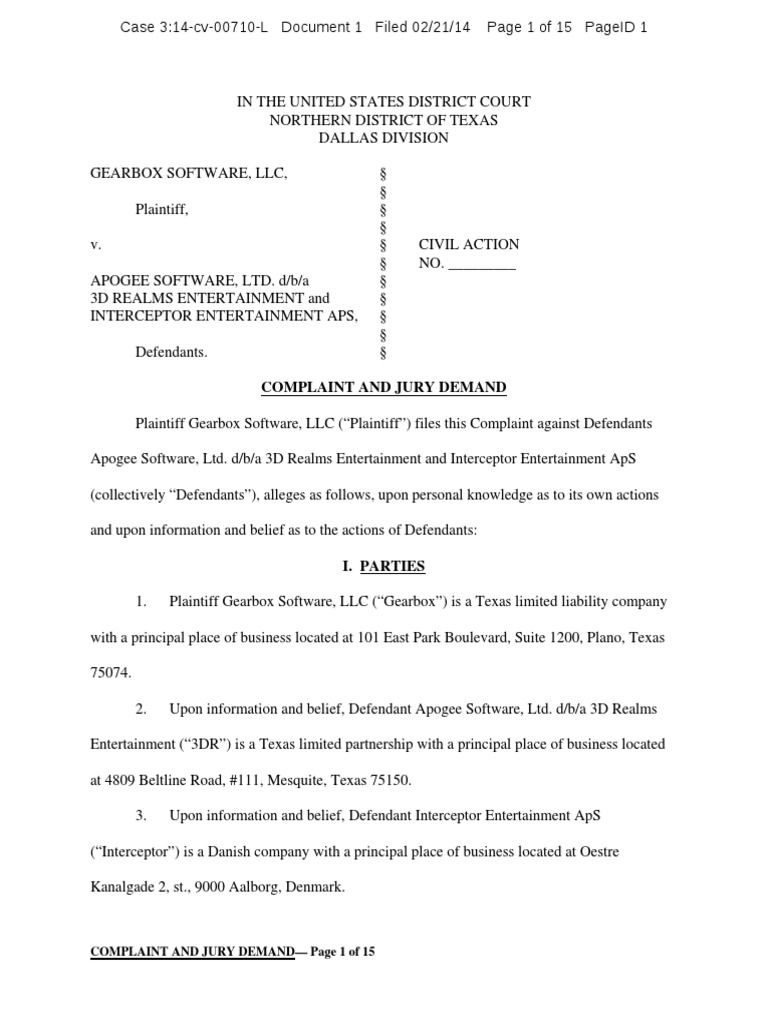Gearbox v. Apogee d/b/a 3D Realms, Interceptor, 2014, Filed Complaint