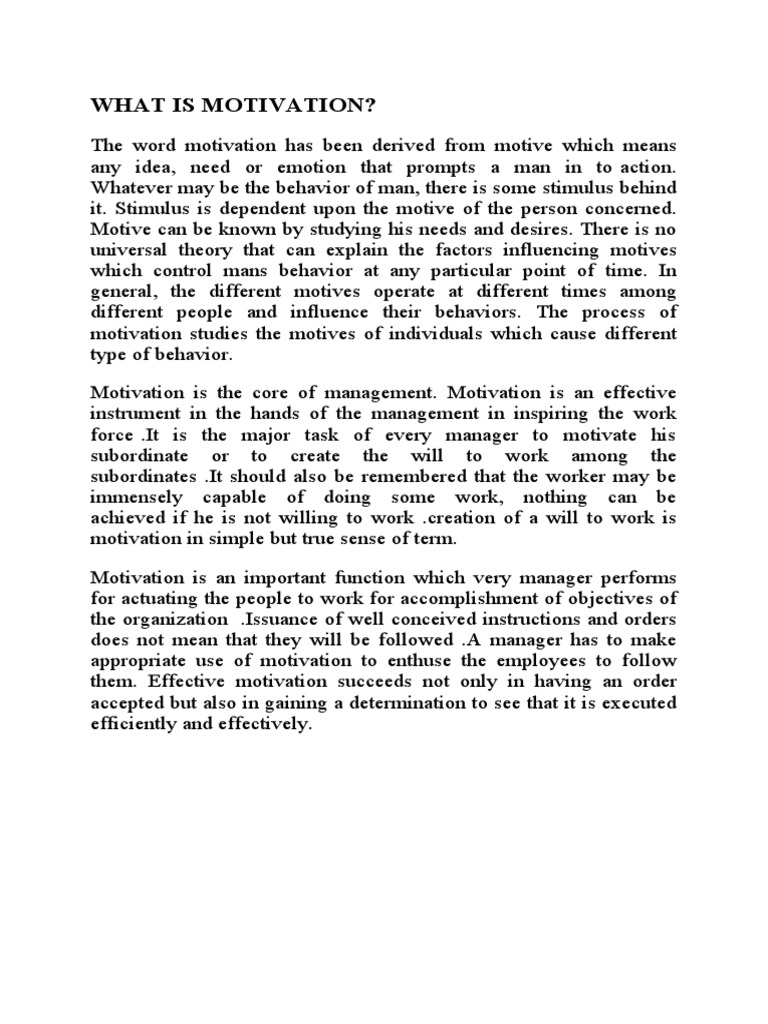 The word motivation has been derived from motive which means any idea, need or emotion that prompts a man in to action. Whatever may be the behavior of man, there is some stimulus behind it. Stimulus is dependent upon the motive of the person concerned. Motive can be known by studying his needs and desires. There is no universal theory that can explain the factors influencing motives which control mans behavior at any particular point of time. In general, the different motives operate at different times among different people and influence their behaviors. The process of motivation studies the motives of individuals which cause different type of behavior. Motivation is the core of management. Motivation is an effective instrument in the hands of the management in inspiring the work force .It is the ma or task of every manager to motivate his subordinate or to create the will to work among the subordinates .It should also be remembered that the worker may be immensely capable of doing some work, nothing can be achieved if he is not willing to work .creation of a will to work is motivation in simple but true sense of term. Motivation is an important function which very manager performs for actuating the people to work for accomplishment of ob ectives of the organi!ation .Issuance of well conceived instructions and orders does not mean that they will be followed ." manager has to make appropriate use of motivation to enthuse the employees to follow them. #ffective motivation succeeds not only in having an order accepted but also in gaining a determination to see that it is executed efficiently and effectively.