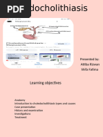 Common bile duct (CBD) stone (Choledocholithiasis) Choledocholithiasis is a disease of the common bile duct. The common bile duct forms at the junction of the cystic duct (from the gallbladder) and the common hepatic duct (from the liver). It drains bile into the duedenum (the first part of the small intestine).