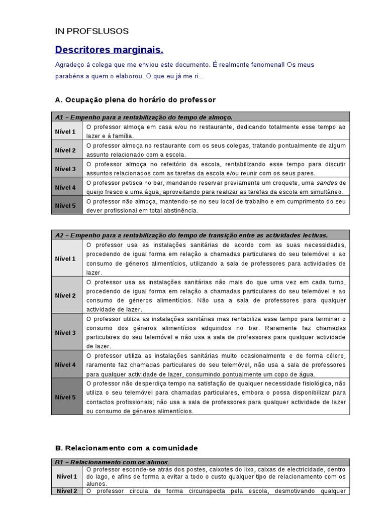 em casos de compro$ada ur!. !rel+as e outras operaç-es em fol+a de c'lculo para re!isto de todas as acti$idades escolares Partil+a com os seus pares o entusiasmo pelo re!isto di!ital sistem'tico de toda a informaç)o da escola Nível 1 Nível 2 Nível 3 Nível 4 Nível 5 ". utilizando*as com al!uma dificuldade mas na tentati$a de renta#ilizar tempo. atende uma c+amada telef"nica de um encarre!ado de educaç)o no inter$alo entre aulas O professor esta#elece uma relaç)o estreita com os encarre!ados de educaç)o 3la#ora um mapa com $'rios percursos de forma a a#ran!er todas as resid. e disponi#ilizando*se para adaptar as suas f.ncias dos encarre!ados de educaç)o da sua direcç)o de turma ao lon!o da semana 2umpre o percurso esta#elecido diariamente ap"s a saída da escola e antes de se diri!ir ao seu lar O professor esta#elece uma relaç)o de amizade com os encarre!ados de educaç)o.rias às necessidades da%ueles Nível 2 Nível 3 Nível 4 Nível 5 B3 – Relacionamento com o rgão de gestão! vulgo o "irector. limitando o tempo destinado a cada encarre!ado de educaç)o em %uatro minutos e cin%uenta e tr.ncia Pontualmente. a$eri!uando e procurando soluç-es &unto de outros cole!as. esforçando*se por n)o danificar as pro!ramaç-es e tentando renta#ilizar ao m'0imo os instrumentos postos ao seu dispor O professor tra#al+a ale!remente com as #ases de dados disponi#ilizadas pelo "r!)o de !est)o. dando importantes contri#utos para mel+orar as e0istentes e apresentando su!est-es de no$as #ases. inte!rando*se perfeitamente nas suas acti$idades 1lmoça com os alunos fre%uentemente no refeit"rio e/ou nos restaurantes das pro0imidades da escola 2on$ida*os para festas familiares e/ou fre%uenta com eles as discotecas nocturnas desfrutando da sua compan+ia B2 – Relacionamento com os encarregados de educação Nível 1 O professor nunca est' disponí$el para comunicar com os encarre!ados de educaç)o fora do seu +or'rio de atendimento O professor encontra*se disponí$el apenas durante o seu +or'rio de atendimento.s s se!undos O professor est' disponí$el para comunicar com os encarre!ados de educaç)o fora do seu +or'rio de atendimento. relacionando*se com os mesmos diariamente. O professor n)o acol+e com a!rado as su!est-es de #ases de dados propostas pelo "r!)o de !est)o Recol+e dados atra$. entidades e or!anismos especializados nas di$ersas pro#lem'ticas O professor corre atr's dos alunos. con$i$endo estreitamente com eles durante os tempos de transiç)o entre as aulas. O professor acol+e pontualmente com a!rado al!umas #ases de dados propostas pelo "r!)o de !est)o da escola. Reali#ação do processo ensino$Aprendi#a%e #1 – &!ili#ação de e'uipa en!os para o processo de ensino$aprendi#a%e . incluindo os fins*de*semana. tra#al+o e recursos O professor acol+e com a!rado as su!est-es de #ases de dados propostas pelo "r!)o de !est)o O professor acol+e com #astante a!rado as su!est-es de #ases de dados propostas pelo "r!)o de !est)o.s de con$ersas com os inter$enientes e procede ao re!isto de percenta!ens e ela#oraç)o de estatísticas utilizando a regra de três simples.Nível 3 Nível 4 Nível 5 apro0imaç)o por parte dos alunos O professor responde naturalmente às a#orda!ens informais feitas pelos alunos. mantendo uma postura s. le$ando*os a intera!ir e confidenciar os aspectos íntimos da sua $ida pessoal 1poia*os na resoluç)o dos seus pro#lemas.ria face aos assuntos tratados O professor demonstra uma preocupaç)o para com os pro#lemas pessoais dos alunos.