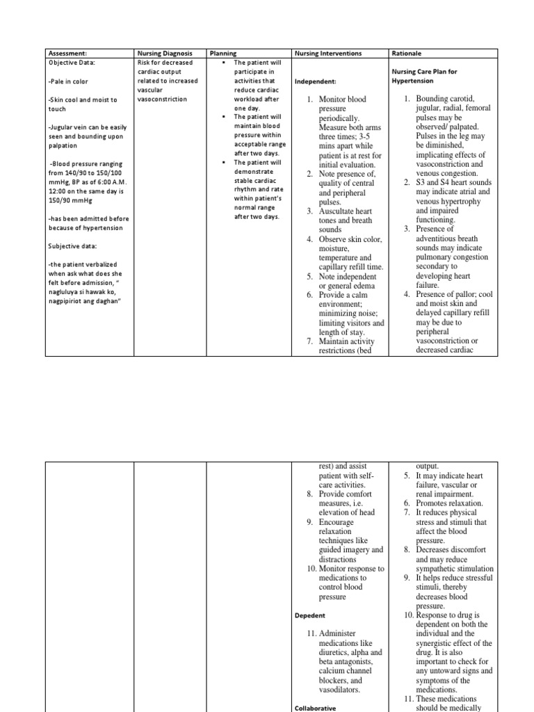 Rationale Nursing Care Plan for Hypertension