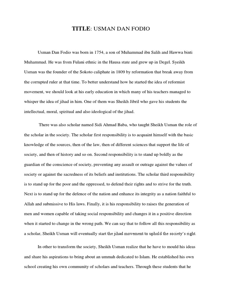 Usman Dan Fodio was born in 1754, a son of Muhammad ibn Salih and Hawwa binti Muhammad. He was from Fulani ethnic in the Hausa state and grew up in Degel. Syeikh Usman was the founder of the Sokoto caliphate in 1809 by reformation that break away from the corrupted ruler at that time. To better understand how he started the idea of reformist movement, we should look at his early education in which many of his teachers managed to whisper the idea of jihad in him. One of them was Sheikh Jibril who gave his students the intellectual, moral, spiritual and also ideological of the jihad. There was also scholar named Sidi Ahmad Baba, who taught Sheikh Usman the role of the scholar in the society. The scholar first responsibility is to acquaint himself with the basic knowledge of the sources, then of the law, then of different sciences that support the life of society, and then of history and so on. Second responsibility is to stand up boldly as the guardian of the conscience of society, preventing any assault or outrage against the values of society or against the sacredness of its beliefs and institutions. The scholar third responsibility is to stand up for the poor and the oppressed, to defend their rights and to strive for the truth. Next is to stand up for the defence of the nation and enhance its integrity as a nation faithful to Allah and submissive to His laws. Finally, it is his responsibility to raises the generation of men and women capable of taking social responsibility and changes it in a positive direction when it started to change in the wrong path. We can say that to follow all this responsibility as a scholar, Sheikh Usman will eventually start the jihad movement to uphold the societys right. In other to transform the society, Sheikh Usman realize that he have to mould his ideas and share his aspirations to bring about an ummah dedicated to Islam. He established his own school creating his own community of scholars and teachers. Through these students that he
