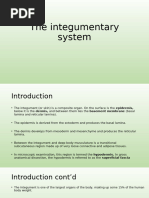 The integumentary system includes the skin and its associated structures - nails, hair, skin glands. Its functions include: (pp 149 150) - protection from physical, chemical and biological assaults on the body. It is extremely rare that microorganisms are capable of penetrating intact skin. - regulation of body temperature. Sweat glands cool the skin by evaporation. Blood vessels within the skin dilate if body temperature is too warm allowing heat to radiate of the skin. If too cold, these vessels constrict to conserve body heat. - sunlight on the skin can convert certain steroids into some other useful compounds and thus the skin serves a metabolic function. - excretion. Some salts and nitrogenous wastes are excreted through the skin though most are excreted in the urinary system. - the blood vessels of the skin act as a blood reservoir. The body can shunt blood to other parts where it may be needed. Structure The skin has two main layers, the more superficial epidermis and the deeper dermis. The most abundant stratified squamous cells of the epidermis are keratinocytes (containing the tough fibrous protein keratin). There are also melanocytes which make melanin, the pigment that protects against ultraviolet rays and accounts for skin color differences among people. All people have approximately the same number of melanocytes in the skin but these cells produce varying amounts of melanin. The epidermis is composed of four or five layers or strata: 1. The deepest layer of the epidermis is the stratum basale. It is a single row of highly mitotic cells. As the cells divide, they push outward toward the surface. About 1 in 10 to 1 in 4 cells of the stratum basale are melanocytes. 2. The next layer (going towards the surface) is the stratum spinosum. It is a few cells thick and mitosis may also occur here but with less frequency. In this layer we find most of the Langerhans cell which are modified white blood cells and phagocytes of foreign material. The stratum granulosum is the third layer and is only a few cells thick. Because cells are now some distance from a blood supply, cells here begin to die. These cells, as are the cells above it are very flattened. The stratum lucidum is a band of clear, dead keratinocytes found only in the palms, soles and fingertips. Because of this extra layer the skin here is referred to as thick skin, all other skin is thin skin. The stratum corneum is the most superficial layer. It is comprised of about two dozen dead, flattened keratinocytes. Although made of dead cells, this is the most protective layer.