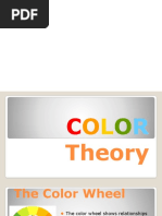This document discusses color, including how it is perceived by the eye through light receptors, the color wheel and primary/secondary colors, dimensions of color like hue, value and intensity, and how to manipulate color through tints, shades and temperature. It explains that color is light reflected off objects, the eye contains rods and cones that detect different wavelengths as color, and the color wheel diagrams the relationships between hues and saturation.