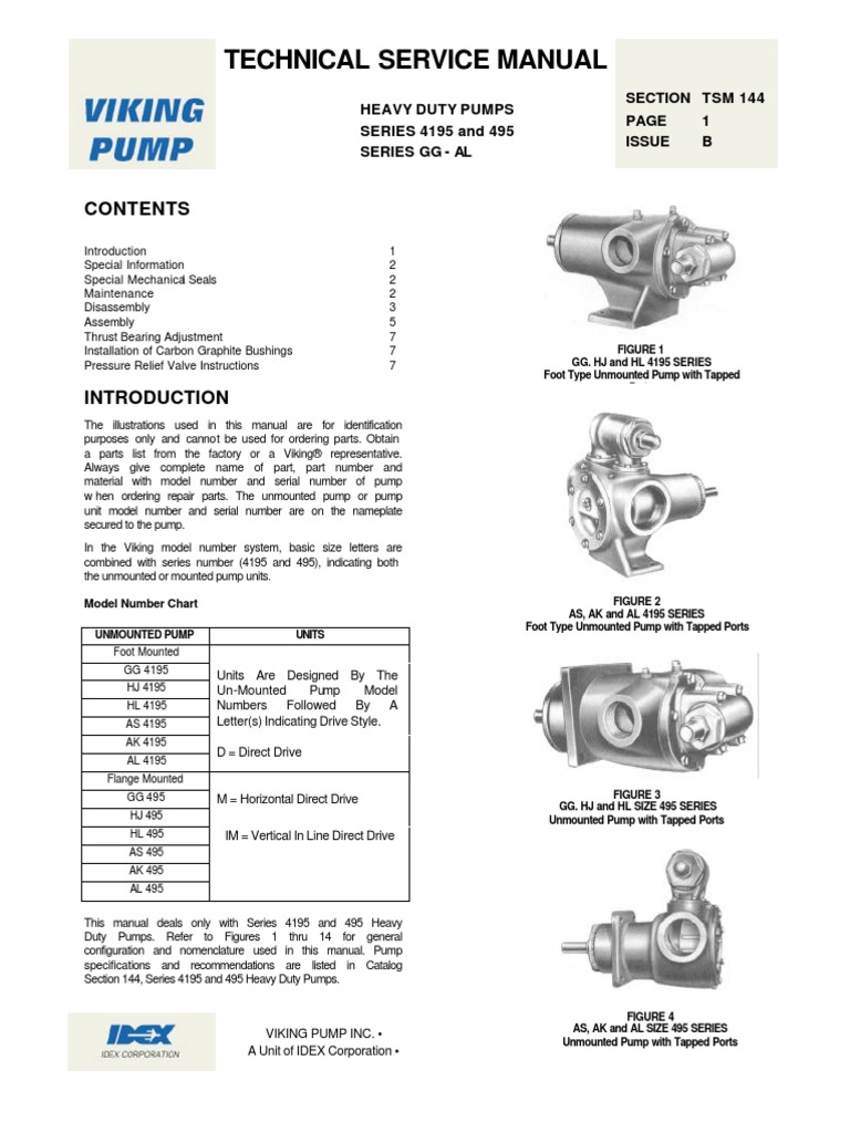 The illustrations used in this manual are for identification purposes only and cannot be used for ordering parts. Obtain a parts list from the factory or a Viking representative. Always give complete name of part, part number and material with model number and serial number of pump w hen ordering repair parts. The unmounted pump or pump unit model number and serial number are on the nameplate secured to the pump. In the Viking model number system, basic size letters are combined with series number (4195 and 495), indicating both the unmounted or mounted pump units. Model Number Chart