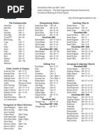 Selects all objects on a slide in slide view, or all slides in slide editor view. Start spell checker Cut (X) the current selection, Copy it (C) or Paste it (V) (notice that X and C make good sense, and V is the next key along the bottom row of the keyboard) Duplicate the currently selected object(s). Open the Find or Replace dialogue box (these are the same as in Word and Excel, only Ctrl + G is missing) 2000: Show or hide guides. 2003: Open the Grid and Guides dialogue box to turn on or off snap to grid and alter size of grid Select every object on the slide in turn. This is ideal for small objects or ones which are covered by larger items. Same as above, but reverses direction Moves the active object one grid cell in that direction. Moves the active object only one pixel in that direction. Moves up or down a slide in the slideshow.