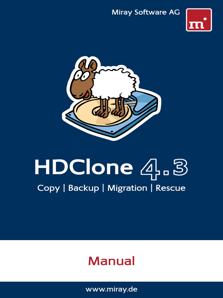 4 Table of Contents 3.5 USB . . . . . . . . . . . . . . . . . . . . . . . . . . . . . . . . . . . . . . . . . . . . . . . . . . . . . . . 22 3.5.1 Mass-Storage-Class . . . . . . . . . . . . . . . . . . . . . . . . . . . . . . . . . . 23 3.5.2 UHCI, OHCI and EHCI . . . . . . . . . . . . . . . . . . . . . . . . . . . . . . . . 23 3.5.3 XHCI . . . . . . . . . . . . . . . . . . . . . . . . . . . . . . . . . . . . . . . . . . . . . . . 23 3.5.4 Hubs . . . . . . . . . . . . . . . . . . . . . . . . . . . . . . . . . . . . . . . . . . . . . . . 23 3.6 Firewire (IEEE1394) . . . . . . . . . . . . . . . . . . . . . . . . . . . . . . . . . . . . . . . . . 23 4 Installation . . . . . . . . . . . . . . . . . . . . . . . . . . . . . . . . . . . . . . . . . . . . . . . . . . . 24 4.1 Introduction . . . . . . . . . . . . . . . . . . . . . . . . . . . . . . . . . . . . . . . . . . . . . . . . 24 4.1.1 Bootable medium . . . . . . . . . . . . . . . . . . . . . . . . . . . . . . . . . . . 24 4.1.2 Software package . . . . . . . . . . . . . . . . . . . . . . . . . . . . . . . . . . . 24 4.1.3 Miray Virtual Disk . . . . . . . . . . . . . . . . . . . . . . . . . . . . . . . . . . . . 24 4.2 Installation in Windows . . . . . . . . . . . . . . . . . . . . . . . . . . . . . . . . . . . . . . 25 4.2.1 HDClone Setup . . . . . . . . . . . . . . . . . . . . . . . . . . . . . . . . . . . . . 25 4.2.2 Boot-Setup & Emergency Medium . . . . . . . . . . . . . . . . . . . . . 26 4.2.2.1 CD/DVD writer not selectable . . . . . . . . . . . . . . . . . 26 4.2.3 Bootable Windows XP CD . . . . . . . . . . . . . . . . . . . . . . . . . . . . 27 4.3 Installation with other operating systems . . . . . . . . . . . . . . . . . . . . . . . 28 4.3.1 Creating a bootable floppy disk . . . . . . . . . . . . . . . . . . . . . . . 28 4.3.2 Creating a bootable CD/DVD . . . . . . . . . . . . . . . . . . . . . . . . . 28 4.4 Booting from USB key . . . . . . . . . . . . . . . . . . . . . . . . . . . . . . . . . . . . . . . 29 5 Program instructions . . . . . . . . . . . . . . . . . . . . . . . . . . . . . . . . . . . . . . . . . . . 30 5.1 Preliminary steps . . . . . . . . . . . . . . . . . . . . . . . . . . . . . . . . . . . . . . . . . . . . 30 5.2 Starting the program . . . . . . . . . . . . . . . . . . . . . . . . . . . . . . . . . . . . . . . . 30 5.2.1 Self-booting program . . . . . . . . . . . . . . . . . . . . . . . . . . . . . . . . . 30 5.2.2 Windows program . . . . . . . . . . . . . . . . . . . . . . . . . . . . . . . . . . . 31 5.2.3 Command line program . . . . . . . . . . . . . . . . . . . . . . . . . . . . . . 31 5.3 Program screen . . . . . . . . . . . . . . . . . . . . . . . . . . . . . . . . . . . . . . . . . . . . . 31 5.3.1 Status field . . . . . . . . . . . . . . . . . . . . . . . . . . . . . . . . . . . . . . . . . . 32 5.3.2 Operating field . . . . . . . . . . . . . . . . . . . . . . . . . . . . . . . . . . . . . . 32 5.4 Operation . . . . . . . . . . . . . . . . . . . . . . . . . . . . . . . . . . . . . . . . . . . . . . . . . . 32 5.4.1 Graphical control elements . . . . . . . . . . . . . . . . . . . . . . . . . . . 32 5.4.2 Operation with keyboard and mouse . . . . . . . . . . . . . . . . . . 33 5.4.2.1 Keyboard operation . . . . . . . . . . . . . . . . . . . . . . . . . . 33 5.4.2.2 Mouse operation . . . . . . . . . . . . . . . . . . . . . . . . . . . . . 34 5.5 Help . . . . . . . . . . . . . . . . . . . . . . . . . . . . . . . . . . . . . . . . . . . . . . . . . . . . . . 34 5.6 Selecting a copy mode . . . . . . . . . . . . . . . . . . . . . . . . . . . . . . . . . . . . . . 34 5.6.1 Category view . . . . . . . . . . . . . . . . . . . . . . . . . . . . . . . . . . . . . . 34 5.6.2 Classic view . . . . . . . . . . . . . . . . . . . . . . . . . . . . . . . . . . . . . . . . . 35 5.7 Selecting data source and target . . . . . . . . . . . . . . . . . . . . . . . . . . . . . . 35 5.7.1 Selecting a drive . . . . . . . . . . . . . . . . . . . . . . . . . . . . . . . . . . . . . 36
