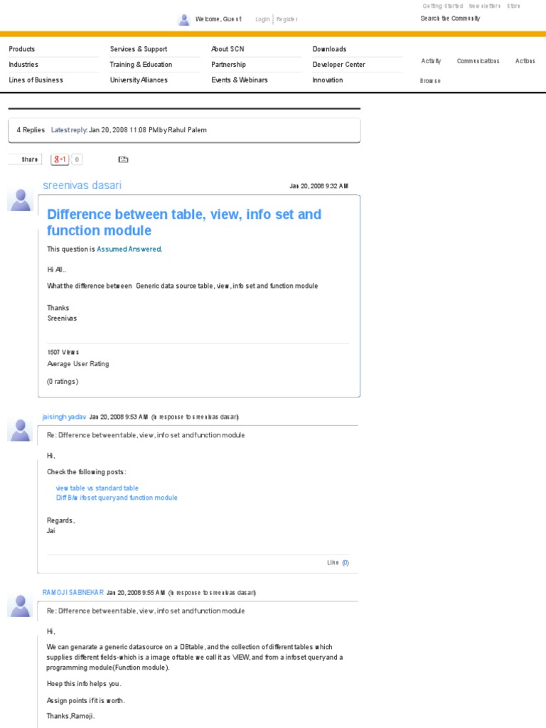 jaisingh yadav Jan 20, 2008 9:53 AM (in response to sreenivas dasari) Re: Difference between table, view, info set and function module Hi, Check the following posts: view table vs standard table Diff B/w ifoset query and function module Regards, Jai