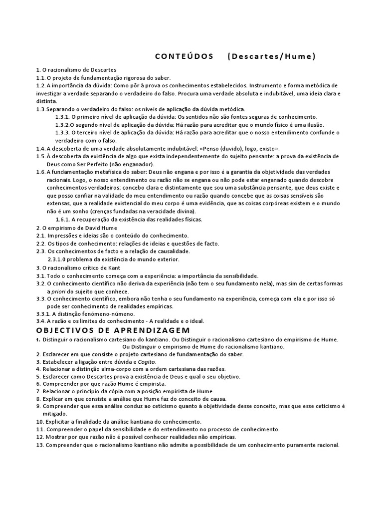 Ou Distinguir o empirismo de Hume do racionalismo kantiano. 2. Esclarecer em que consiste o projeto cartesiano de fundamentação do saber. 3. Estabelecer a ligação entre dúvida e Cogito. 4. Relacionar a distinção alma-corpo com a ordem cartesiana das razões. 5. Esclarecer como Descartes prova a existência de Deus e qual o seu objetivo. 6. Compreender por que razão Hume é empirista. 7. Relacionar o princípio da cópia com a posição empirista de Hume. 8. Explicar em que consiste a análise que Hume faz do conceito de causa. 9. Compreender que essa análise conduz ao ceticismo quanto à objetividade desse conceito, mas que esse ceticismo é mitigado. 10. Explicitar a finalidade da análise kantiana do conhecimento. 11 . Compreender o papel da sensibilidade e do entendimento no processo de conhecimento. 12. Mostrar por que razão não é possível conhecer realidades não empíricas. 13. Compreender que o racionalismo kantiano não admite a possibilidade de um conhecimento puramente racional.