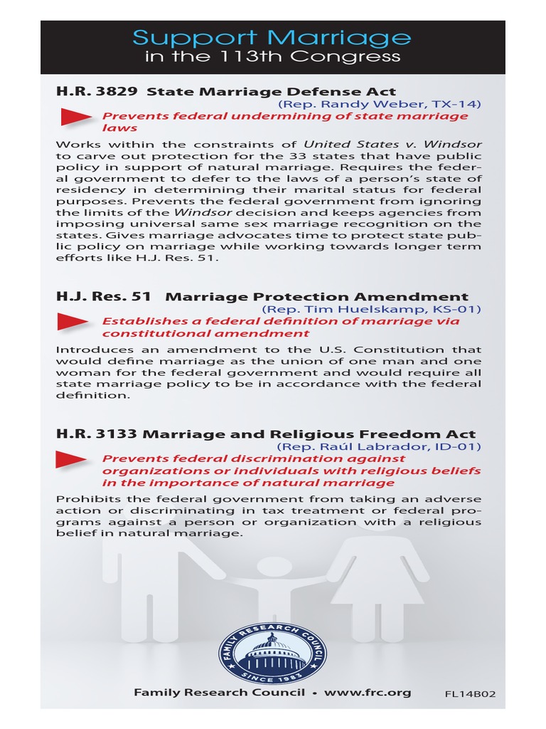 Support Marriage in the 113th congress. H.R. 3829 State Marriage Defense Act (rep. Randy Weber, TX-14) Prevents federal undermining of state marriage laws.
