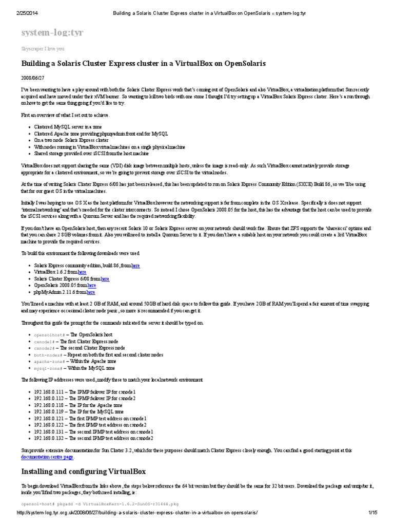 The OpenSolaris host The first Cluster Express node c x n o d e 2 # The second Cluster Express node b o t h n o d e s # Repeat on both the first and second cluster nodes a p a c h e z o n e # Within the Apache zone m y s q l z o n e # Within the MySQL zone The following IP addresses were used, modify these to match your local network environment [Link] The IPMP failover IP for cxnode1 [Link] The IPMP failover IP for cxnode2 [Link] The IP for the Apache zone [Link] The IP for the MySQL zone [Link] The first IPMP test address on cxnode1 [Link] The first IPMP test address on cxnode2 [Link] The second IPMP test address on cxnode1 [Link] The second IPMP test address on cxnode2 Sun provide extensive documentation for Sun Cluster 3.2, which for these purposes should match Cluster Express closely enough. You can find a good starting point at this documentation centre page.