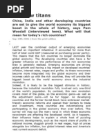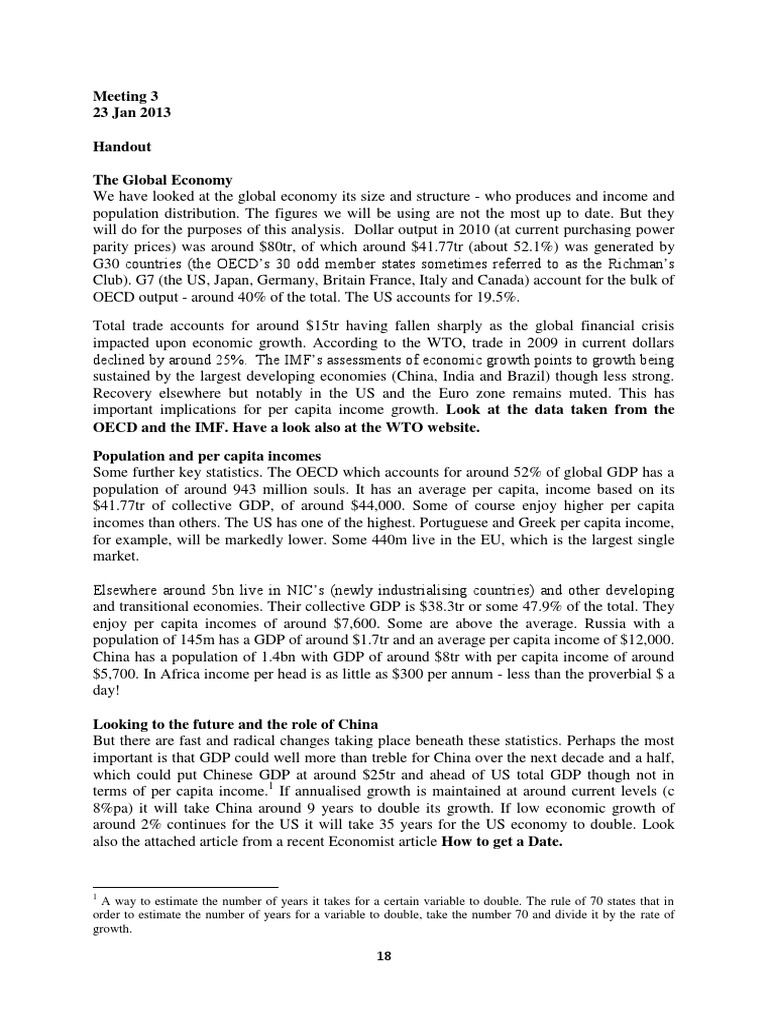 structure - who produces and income and population distribution. The figures we will be using are not the most up to date. But they will do for the purposes of this analysis. Dollar output in 2010 (at current purchasing power parity prices) was around $80tr, of which around $41.77tr (about 52.1%) was generated by G30 countries (the OECDs 30 odd member states sometimes referred to as the Richmans Club). G7 (the US, Japan, Germany, Britain France, Italy and Canada) account for the bulk of OECD output - around 40% of the total. The US accounts for 19.5%. Total trade accounts for around $15tr having fallen sharply as the global financial crisis impacted upon economic growth. According to the WTO, trade in 2009 in current dollars declined by around 25%. The IMFs assessments of economic growth points to growth being sustained by the largest developing economies (China, India and Brazil) though less strong. Recovery elsewhere but notably in the US and the Euro zone remains muted. This has important implications for per capita income growth. Look at the data taken from the OECD and the IMF. Have a look also at the WTO website. Population and per capita incomes Some further key statistics. The OECD which accounts for around 52% of global GDP has a population of around 943 million souls. It has an average per capita, income based on its $41.77tr of collective GDP, of around $44,000. Some of course enjoy higher per capita incomes than others. The US has one of the highest. Portuguese and Greek per capita income, for example, will be markedly lower. Some 440m live in the EU, which is the largest single market. Elsewhere around 5bn live in NICs (newly industrialising countries) and other developing and transitional economies. Their collective GDP is $38.3tr or some 47.9% of the total. They enjoy per capita incomes of around $7,600. Some are above the average. Russia with a population of 145m has a GDP of around $1.7tr and an average per capita income of $12,000. China has a population of 1.4bn with GDP of around $8tr with per capita income of around $5,700. In Africa income per head is as little as $300 per annum - less than the proverbial $ a day! Looking to the future and the role of China But there are fast and radical changes taking place beneath these statistics. Perhaps the most important is that GDP could well more than treble for China over the next decade and a half, which could put Chinese GDP at around $25tr and ahead of US total GDP though not in terms of per capita income.1 If annualised growth is maintained at around current levels (c 8%pa) it will take China around 9 years to double its growth. If low economic growth of around 2% continues for the US it will take 35 years for the US economy to double. Look also the attached article from a recent Economist article How to get a Date.