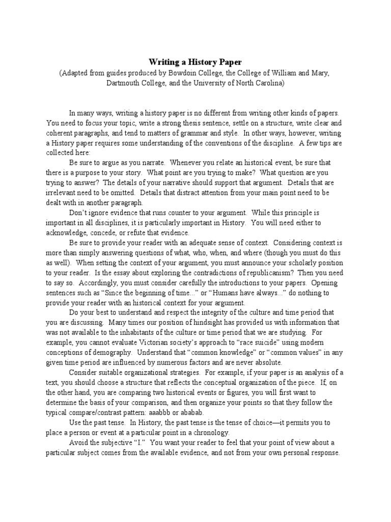 "n many ways, writing a history paper is no different from writing other #inds of papers$ %ou need to focus your topic, write a strong thesis sentence, settle on a structure, write clear and coherent paragraphs, and tend to matters of grammar and style$ "n other ways, however, writing a &istory paper re'uires some understanding of the conventions of the discipline$ A few tips are collected here( Be sure to argue as you narrate$ Whenever you relate an historical event, be sure that there is a purpose to your story$ What point are you trying to ma#e) What 'uestion are you trying to answer) *he details of your narrative should support that argument$ Details that are irrelevant need to be omitted$ Details that distract attention from your main point need to be dealt with in another paragraph$ Don+t ignore evidence that runs counter to your argument$ While this principle is important in all disciplines, it is particularly important in &istory$ %ou will need either to ac#nowledge, concede, or refute that evidence$ Be sure to provide your reader with an ade'uate sense of conte,t$ Considering conte,t is more than simply answering 'uestions of what, who, when, and where (though you must do this as well!$ When setting the conte,t of your argument, you must announce your scholarly position to your reader$ "s the essay about e,ploring the contradictions of republicanism) *hen you need to say so$ Accordingly, you must consider carefully the introductions to your papers$ -pening sentences such as ./ince the beginning of time$$$0 or .&umans have always$$$0 do nothing to provide your reader with an historical conte,t for your argument$ Do your best to understand and respect the integrity of the culture and time period that you are discussing$ Many times our position of hindsight has provided us with information that was not available to the inhabitants of the culture or time period that we are studying$ 1or e,ample, you cannot evaluate 2ictorian society+s approach to .race suicide0 using modern conceptions of demography$ Understand that .common #nowledge0 or .common values0 in any given time period are influenced by numerous factors and are never absolute$ Consider suitable organi3ational strategies$ 1or e,ample, if your paper is an analysis of a te,t, you should choose a structure that reflects the conceptual organi3ation of the piece$ "f, on the other hand, you are comparing two historical events or figures, you will first want to determine the basis of your comparison, and then organi3e your points so that they follow the typical compare4contrast pattern( aaabbb or ababab$ Use the past tense$ "n &istory, the past tense is the tense of choice5it permits you to place a person or event at a particular point in a chronology$ Avoid the sub6ective ."$0 %ou want your reader to feel that your point of view about a particular sub6ect comes from the available evidence, and not from your own personal response$