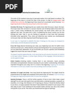 have an idea that will help you answer the 'uestion( these sections, therefore, are not as hard to write$ But these middle parts of the paper can+t 6ust come out of thin air7 they need to be introduced and they need to be concluded in a way that ma#es sense to your reader$ *ry writing a tentative introduction first and then changing it later or writing your introduction last$ %ou may thin# that you have to write your introduction first, but that isn+t necessarily true, and it isn+t always the most effective way to craft a good introduction$ %ou may find that you don+t #now what you+re going to argue at the beginning of the writing process, and only through the e,perience of writing your paper do you discover your main argument$ "t is perfectly fine to start out trying to argue a particular point, but wind up arguing something slightly or even dramatically different by the time you+ve written most of the paper$ *he writing process can be an important way to organi3e your ideas, thin# through complicated issues, refine your thoughts, and develop a sophisticated argument$ &owever, an introduction written at the beginning of that discovery process will not necessarily reflect what you wind up with at the end$ %ou will need to revise your paper to ma#e sure that the introduction, all of the evidence, and the conclusion reflect the argument you intend$ -pen with an attention grabber$ /ometimes, especially if the topic of your paper is somewhat dry or technical, opening with something catchy can help$ Consider these options( an intriguing e,ample a provocative 'uotation a pu33ling scenario a thought8provo#ing 'uestion *hese attention8grabbing openers might get your reader interested and also help your reader connect to what might otherwise seem a pretty obscure topic$ <ssentially, you can use attention8 grabbers to help your readers see why your topic is relevant and begin to care about your findings and perspectives$ :ay special attention to your first sentence$ "f any sentence in your paper is going to be completely free of errors and vagueness, it should be your first one$ /tart off on the right foot with your readers by ma#ing sure that the first sentence actually says something useful and that it does so in an interesting and error8free way$ Be straightforward and confident$ Assert your main argument confidently$ After all, you can+t e,pect your reader to believe it if it doesn+t sound li#e you believe it@