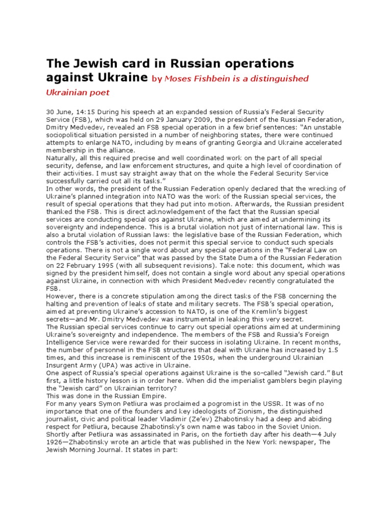 30 June, 14:15During his speech at an expanded session of Russia’s Federal SecurityService (FSB), which was held on 29 January 2009, the president of the Russian Federation,Dmitry Medvedev, revealed an FSB special operation in a few brief sentences: “An unstablesociopolitical situation persisted in a number of neighboring states, there were continuedattempts to enlarge NATO, including by means of granting Georgia and Ukraine acceleratedmembership in the alliance.Naturally, all this required precise and well coordinated work on the part of all specialsecurity, defense, and law enforcement structures, and quite a high level of coordination of their activities. I must say straight away that on the whole the Federal Security Servicesuccessfully carried out all its tasks.” In other words, the president of the Russian Federation openly declared that the wrecking of Ukraine’s planned integration into NATO was the work of the Russian special services, theresult of special operations that they had put into motion. Afterwards, the Russian presidentthanked the FSB. This is direct acknowledgement of the fact that the Russian specialservices are conducting special ops against Ukraine, which are aimed at undermining itssovereignty and independence. This is a brutal violation not just of international law. This isalso a brutal violation of Russian laws: the legislative base of the Russian Federation, whichcontrols the FSB’s activities, does not permit this special service to conduct such specialsoperations. There is not a single word about any special operations in the “Federal Law onthe Federal Security Service” that was passed by the State Duma of the Russian Federationon 22 February 1995 (with all subsequent revisions). Take note: this document, which wassigned by the president himself, does not contain a single word about any special operationsagainst Ukraine, in connection with which President Medvedev recently congratulated theFSB.However, there is a concrete stipulation among the direct tasks of the FSB concerning thehalting and prevention of leaks of state and military secrets. The FSB’s special operation,aimed at preventing Ukraine’s accession to NATO, is one of the Kremlin’s biggestsecrets—and Mr. Dmitry Medvedev was instrumental in leaking this very secret.The Russian special services continue to carry out special operations aimed at underminingUkraine’s sovereignty and independence. The members of the FSB and Russia’s ForeignIntelligence Service were rewarded for their success in isolating Ukraine. In recent months,the number of personnel in the FSB structures that deal with Ukraine has increased by 1.5times, and this increase is reminiscent of the 1950s, when the underground UkrainianInsurgent Army (UPA) was active in Ukraine.One aspect of Russia’s special operations against Ukraine is the so-called “Jewish card.” Butfirst, a little history lesson is in order here. When did the imperialist gamblers begin playingthe “Jewish card” on Ukrainian territory?This was done in the Russian Empire.For many years Symon Petliura was proclaimed a pogromist in the USSR. It was of noimportance that one of the founders and key ideologists of Zionism, the distinguished journalist, civic and political leader Vladimir (Ze’ev) Zhabotinsky had a deep and abidingrespect for Petliura, because Zhabotinsky’s own name was taboo in the Soviet Union.Shortly after Petliura was assassinated in Paris, on the fortieth day after his death—4 July1926—Zhabotinsky wrote an article that was published in the New York newspaper, TheJewish Morning Journal. It states in part: