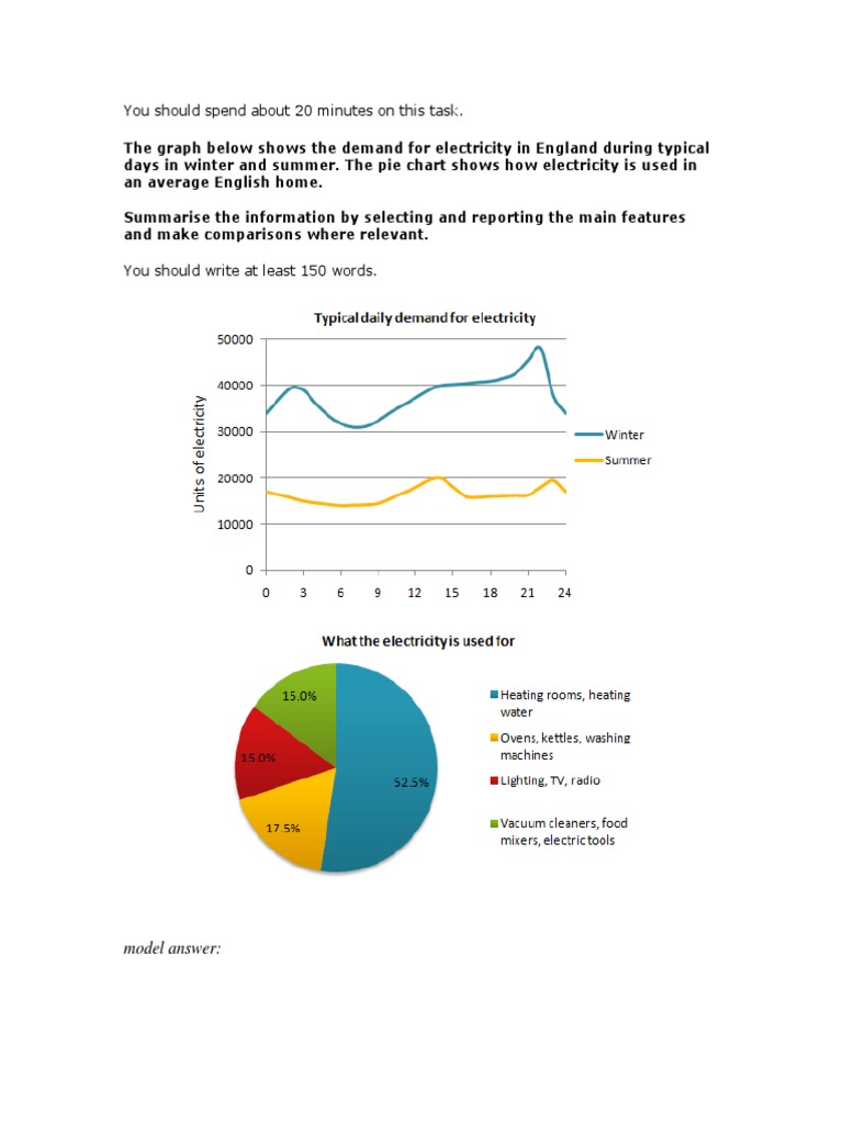 The graph below shows the demand for electricity in England during typical days in winter and summer. The pie chart shows how electricity is used in an average English home. Summarise the information by selecting and reporting the main features and make comparisons where relevant. You should write at least 150 words.