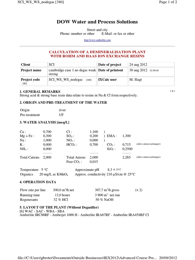 These suggestions and data are based on information we believe to be reliable. They are offered in good faith, but without guarantees, as conditions of use of our products are beyond our control. The plant manufacturer remains therefore responsible for plant performance. Suggestions for uses of our products should not be understood as a recommendation to infringe any patent. Amberpack is a technology licensed by Rohm and Haas Company to selected OEMs. Safety factors should always be smaller than 1.0. Dow Water & Process Solutions SCI_WS_WS_nodegas [380] IXCalc 1.9.1