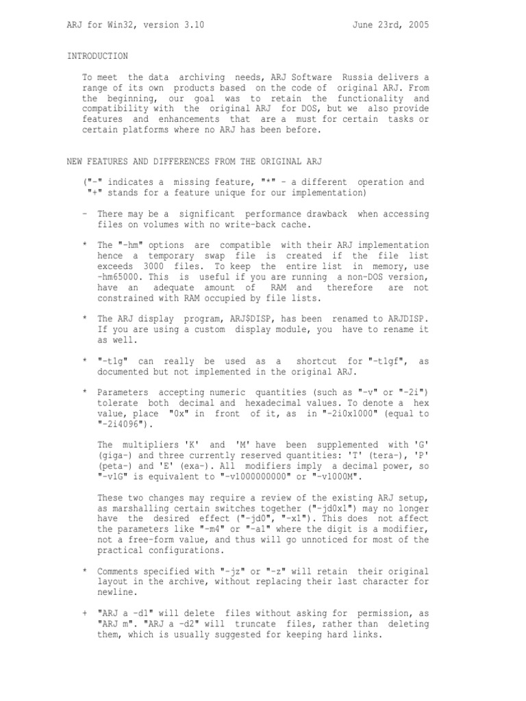 To meet the data archiving needs, ARJ Software Russia delivers a range of its own products based on the code of original ARJ. From the beginning, our goal was to retain the functionality and compatibility with the original ARJ for DOS, but we also provide features and enhancements that are a must for certain tasks or certain platforms where no ARJ has been before. NEW FEATURES AND DIFFERENCES FROM THE ORIGINAL ARJ ("-" indicates a missing feature, "*" - a different operation and "+" stands for a feature unique for our implementation) - There may be a significant performance drawback when accessing files on volumes with no write-back cache. * The "-hm" options are compatible with their ARJ implementation hence a temporary swap file is created if the file list exceeds 3000 files. To keep the entire list in memory, use -hm65000. This is useful if you are running a non-DOS version, have an adequate amount of RAM and therefore are not constrained with RAM occupied by file lists. * The ARJ display program, ARJ$DISP, has been renamed to ARJDISP. If you are using a custom display module, you have to rename it as well. * "-t1g" can really be used as a shortcut for "-t1gf", as documented but not implemented in the original ARJ. * Parameters accepting numeric quantities (such as "-v" or "-2i") tolerate both decimal and hexadecimal values. To denote a hex value, place "0x" in front of it, as in "-2i0x1000" (equal to "-2i4096"). The multipliers 'K' and 'M' have been supplemented with 'G' (giga-) and three currently reserved quantities: 'T' (tera-), 'P' (peta-) and 'E' (exa-). All modifiers imply a decimal power, so "-v1G" is equivalent to "-v1000000000" or "-v1000M". These two changes may require a review of the existing ARJ setup, as marshalling certain switches together ("-jd0x1") may no longer have the desired effect ("-jd0", "-x1"). This does not affect the parameters like "-m4" or "-a1" where the digit is a modifier, not a free-form value, and thus will go unnoticed for most of the practical configurations. * Comments specified with "-jz" or "-z" will retain their original layout in the archive, without replacing their last character for newline. + "ARJ a -d1" will delete files without asking for permission, as "ARJ m". "ARJ a -d2" will truncate files, rather than deleting them, which is usually suggested for keeping hard links.
