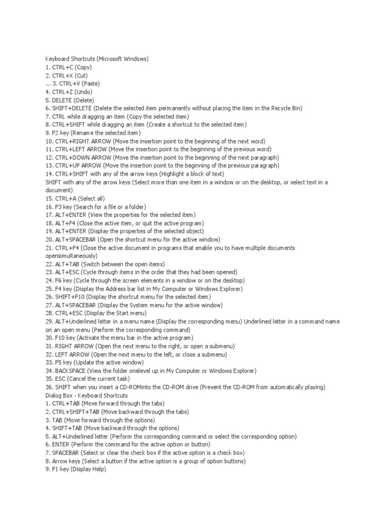 DELETE (Delete) 6. SHIFT+DELETE (Delete the selected item permanently without placing the item in the Recycle Bin) 7. CTRL while dragging an item (Copy the selected item) 8. CTRL+SHIFT while dragging an item (Create a shortcut to the selected item) 9. F2 key (Rename the selected item) 10. CTRL+RIGHT ARROW (Move the insertion point to the beginning of the next word) 11. CTRL+LEFT ARROW (Move the insertion point to the beginning of the previous word) 12. CTRL+DOWN ARROW (Move the insertion point to the beginning of the next paragraph) 13. CTRL+UP ARROW (Move the insertion point to the beginning of the previous paragraph) 14. CTRL+SHIFT with any of the arrow keys (Highlight a block of text) SHIFT with any of the arrow keys (Select more than one item in a window or on the desktop, or select text in a document) 15. CTRL+A (Select all) 16. F3 key (Search for a file or a folder) 17. ALT+ENTER (View the properties for the selected item) 18. ALT+F4 (Close the active item, or quit the active program) 19. ALT+ENTER (Display the properties of the selected object) 20. ALT+SPACEBAR (Open the shortcut menu for the active window) 21. CTRL+F4 (Close the active document in programs that enable you to have multiple documents opensimultaneously) 22. ALT+TAB (Switch between the open items) 23. ALT+ESC (Cycle through items in the order that they had been opened) 24. F6 key (Cycle through the screen elements in a window or on the desktop) 25. F4 key (Display the Address bar list in My Computer or Windows Explorer) 26. SHIFT+F10 (Display the shortcut menu for the selected item) 27. ALT+SPACEBAR (Display the System menu for the active window) 28. CTRL+ESC (Display the Start menu) 29. ALT+Underlined letter in a menu name (Display the corresponding menu) Underlined letter in a command name on an open menu (Perform the corresponding command) 30. F10 key (Activate the menu bar in the active program) 31. RIGHT ARROW (Open the next menu to the right, or open a submenu) 32. LEFT ARROW (Open the next menu to the left, or close a submenu) 33. F5 key (Update the active window) 34. BACKSPACE (View the folder onelevel up in My Computer or Windows Explorer) 35. ESC (Cancel the current task) 36. SHIFT when you insert a CD-ROMinto the CD-ROM drive (Prevent the CD-ROM from automatically playing) Dialog Box - Keyboard Shortcuts 1. CTRL+TAB (Move forward through the tabs) 2. CTRL+SHIFT+TAB (Move backward through the tabs) 3. TAB (Move forward through the options) 4. SHIFT+TAB (Move backward through the options) 5. ALT+Underlined letter (Perform the corresponding command or select the corresponding option) 6. ENTER (Perform the command for the active option or button) 7. SPACEBAR (Select or clear the check box if the active option is a check box) 8. Arrow keys (Select a button if the active option is a group of option buttons) 9. F1 key (Display Help)