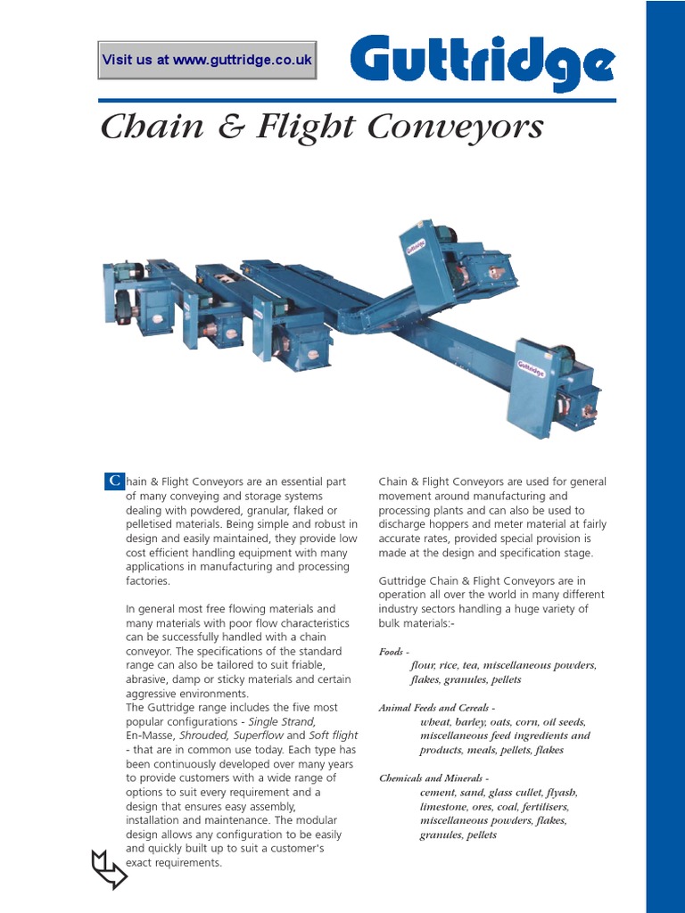 Chain & Flight Conveyors are used for general movement around manufacturing and processing plants and can also be used to discharge hoppers and meter material at fairly accurate rates, provided special provision is made at the design and specification stage. Guttridge Chain & Flight Conveyors are in operation all over the world in many different industry sectors handling a huge variety of bulk materials:Foods flour, rice, tea, miscellaneous powders, flakes, granules, pellets Animal Feeds and Cereals wheat, barley, oats, corn, oil seeds, miscellaneous feed ingredients and products, meals, pellets, flakes Chemicals and Minerals cement, sand, glass cullet, flyash, limestone, ores, coal, fertilisers, miscellaneous powders, flakes, granules, pellets