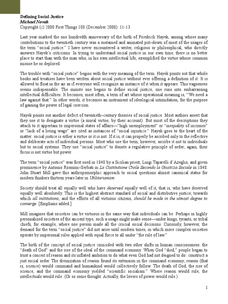 Defining Social Justice Michael Novak Copyright (c) 2000 First Things 108 (December 2000): 11-13.