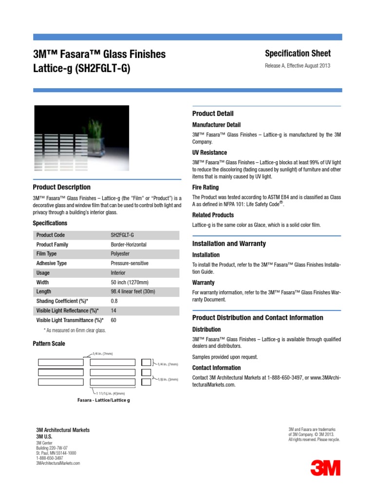 3M Fasara Glass Finishes Lattice-g (the "Film" or Product) is a decorative glass and window film that can be used to control both light and privacy through a buildings interior glass.