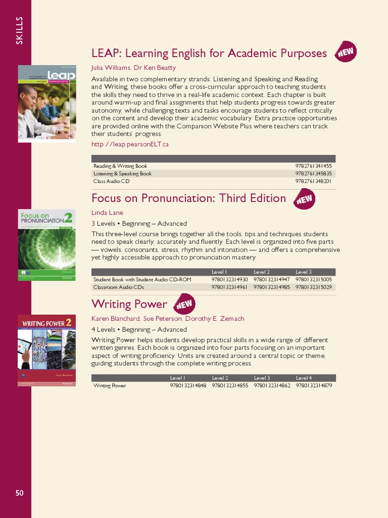 Julia Williams, Dr Ken Beatty Available in two complementary strands: Listening and Speaking and Reading and Writing, these books offer a cross-curricular approach to teaching students the skills they need to thrive in a real-life academic context. Each chapter is built around warm-up and final assignments that help students progress towards greater autonomy, while challenging texts and tasks encourage students to reflect critically on the content and develop their academic vocabulary. Extra practice opportunities are provided online with the Companion Website Plus where teachers can track their students progress. http://leap.pearsonELT.ca
