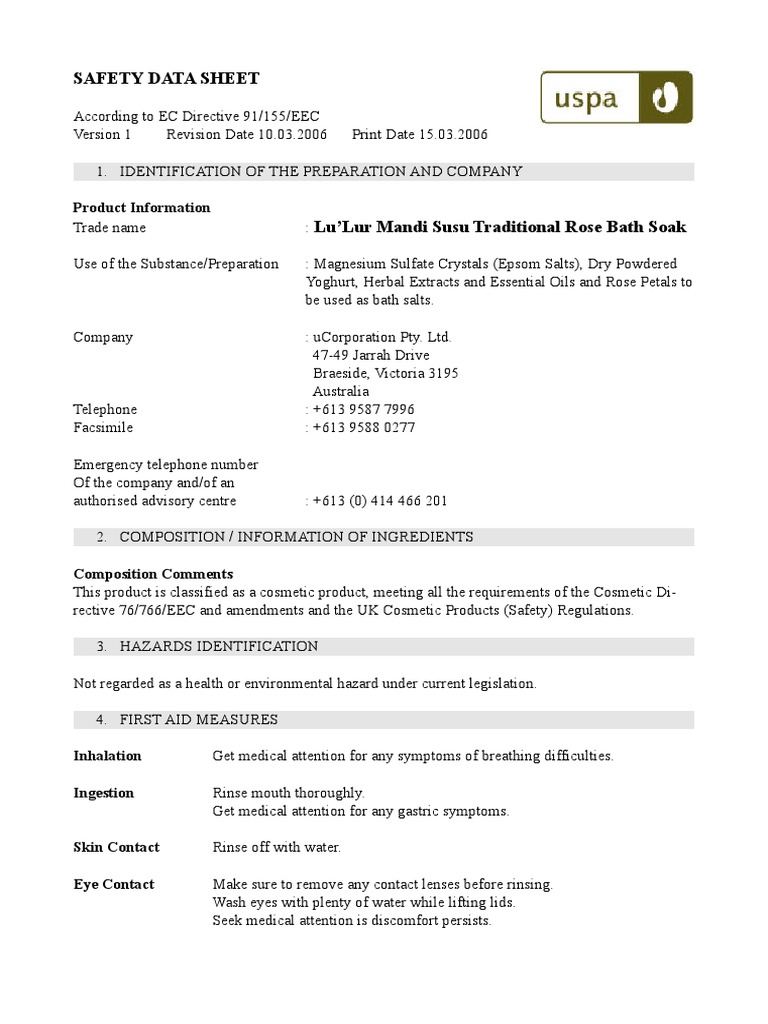 2. COMPOSITION / INFORMATION OF INGREDIENTS Composition Comments This product is classified as a cosmetic product, meeting all the requirements of the Cosmetic Directive 76/766/EEC and amendments and the UK Cosmetic Products (Safety) Regulations. 3. HAZARDS IDENTIFICATION Not regarded as a health or environmental hazard under current legislation. 4. FIRST AID MEASURES Inhalation Ingestion Get medical attention for any symptoms of breathing difficulties. Rinse mouth thoroughly. Get medical attention for any gastric symptoms. Rinse off with water. Make sure to remove any contact lenses before rinsing. Wash eyes with plenty of water while lifting lids. Seek medical attention is discomfort persists.