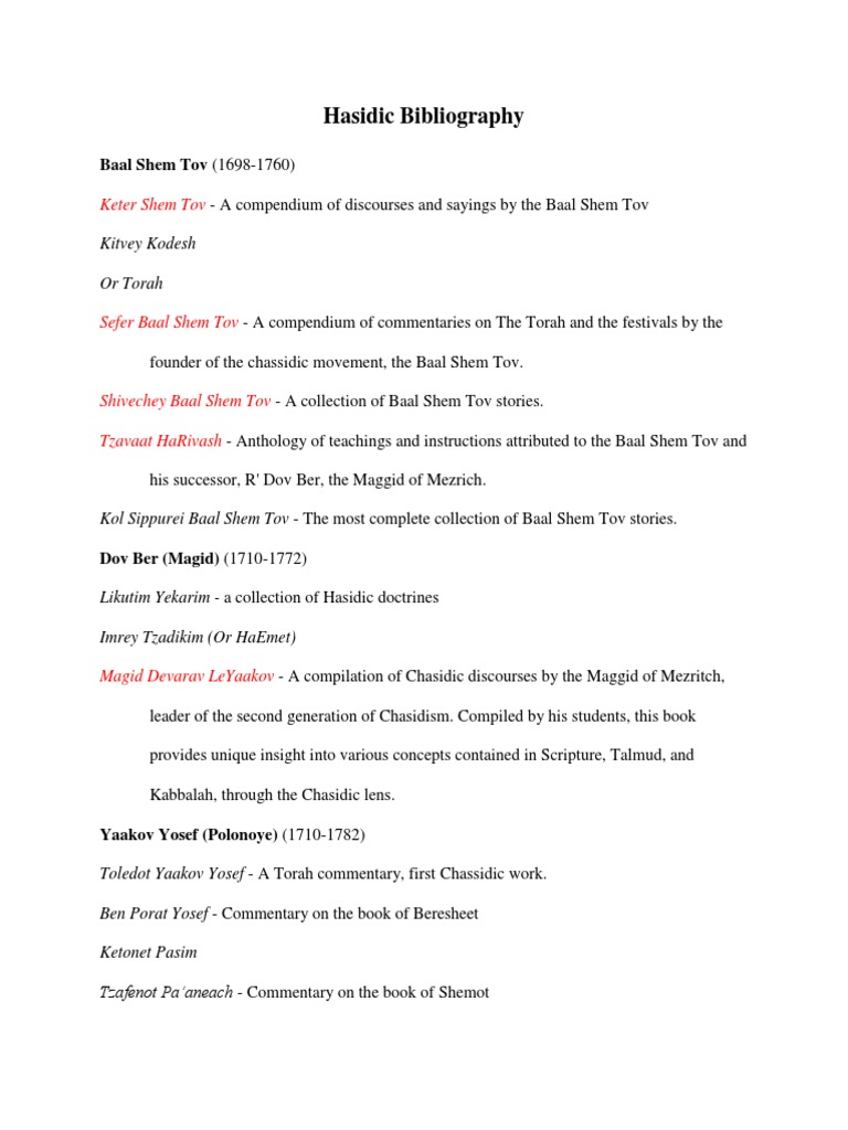 Baal Shem Tov (1698-1760) Keter Shem Tov - A compendium of discourses and sayings by the Baal Shem Tov Kitvey Kodesh Or Torah Sefer Baal Shem Tov - A compendium of commentaries on The Torah and the festivals by the founder of the chassidic movement, the Baal Shem Tov. Shivechey Baal Shem Tov - A collection of Baal Shem Tov stories. Tzavaat HaRivash - Anthology of teachings and instructions attributed to the Baal Shem Tov and his successor, R' Dov Ber, the Maggid of Mezrich. Kol Sippurei Baal Shem Tov - The most complete collection of Baal Shem Tov stories. Dov Ber (Magid) (1710-1772) Likutim Yekarim - a collection of Hasidic doctrines Imrey Tzadikim (Or HaEmet) Magid Devarav LeYaakov - A compilation of Chasidic discourses by the Maggid of Mezritch, leader of the second generation of Chasidism. Compiled by his students, this book provides unique insight into various concepts contained in Scripture, Talmud, and Kabbalah, through the Chasidic lens. Yaakov Yosef (Polonoye) (1710-1782) Toledot Yaakov Yosef - A Torah commentary, first Chassidic work. Ben Porat Yosef - Commentary on the book of Beresheet Ketonet Pasim Tzafenot Paaneach - Commentary on the book of Shemot