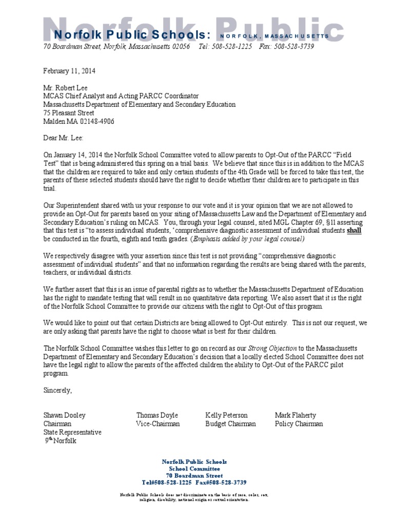 Mr. Robert Lee MCAS Chief Analyst and Acting ARCC Coordinator Massachusetts !e"art#ent of $le#entary and Secondary $ducation %& leasant Street Malden MA 0214'(4)0* !ear Mr. Lee+ ,n -anuary 14, 2014 the .orfol/ School Co##ittee 0oted to allo1 "arents to ,"t(,ut of the ARCC 2Field 3est4 that is being ad#inistered this s"ring on a trial basis. 5e belie0e that since this is in addition to the MCAS that the children are re6uired to ta/e and only certain students of the 4th 7rade 1ill be forced to ta/e this test, the "arents of these selected students should ha0e the right to decide 1hether their children are to "artici"ate in this trial. ,ur Su"erintendent shared 1ith us your res"onse to our 0ote and it is your o"inion that 1e are not allo1ed to "ro0ide an ,"t(,ut for "arents based on your siting of Massachusetts La1 and the !e"art#ent of $le#entary and Secondary $ducation8s ruling on MCAS. 9ou, through your legal counsel, sited M7L Cha"ter *), 1l asserting that this test is 2to assess indi0idual students, :co#"rehensi0e diagnostic assess#ent of indi0idual students shall be conducted in the fourth, eighth and tenth grades. ;$m%has&s added '( (our le)al counsel* 5e res"ecti0ely disagree 1ith your assertion since this test is not "ro0iding 2co#"rehensi0e diagnostic assess#ent of indi0idual students4 and that no infor#ation regarding the results are being shared 1ith the "arents, teachers, or indi0idual districts. 5e further assert that this is an issue of "arental rights as to 1hether the Massachusetts !e"art#ent of $ducation has the right to #andate testing that 1ill result in no 6uantitati0e data re"orting. 5e also assert that it is the right of the .orfol/ School Co##ittee to "ro0ide our citi<ens 1ith the right to ,"t(,ut of this "rogra#. 5e 1ould li/e to "oint out that certain !istricts are being allo1ed to ,"t(,ut entirely. 3his is not our re6uest, 1e are only as/ing that "arents ha0e the right to choose 1hat is best for their children. 3he .orfol/ School Co##ittee 1ishes this letter to go on record as our Stron) +',ect&on to the Massachusetts !e"art#ent of $le#entary and Secondary $ducation8s decision that a locally elected School Co##ittee does not ha0e the legal right to allo1 the "arents of the affected children the ability to ,"t(,ut of the ARCC "ilot "rogra#. Sincerely, Sha1n !ooley Chair#an State Re"resentati0e )th .orfol/ 3ho#as !oyle >ice(Chair#an =elly eterson ?udget Chair#an Mar/ Flaherty olicy Chair#an