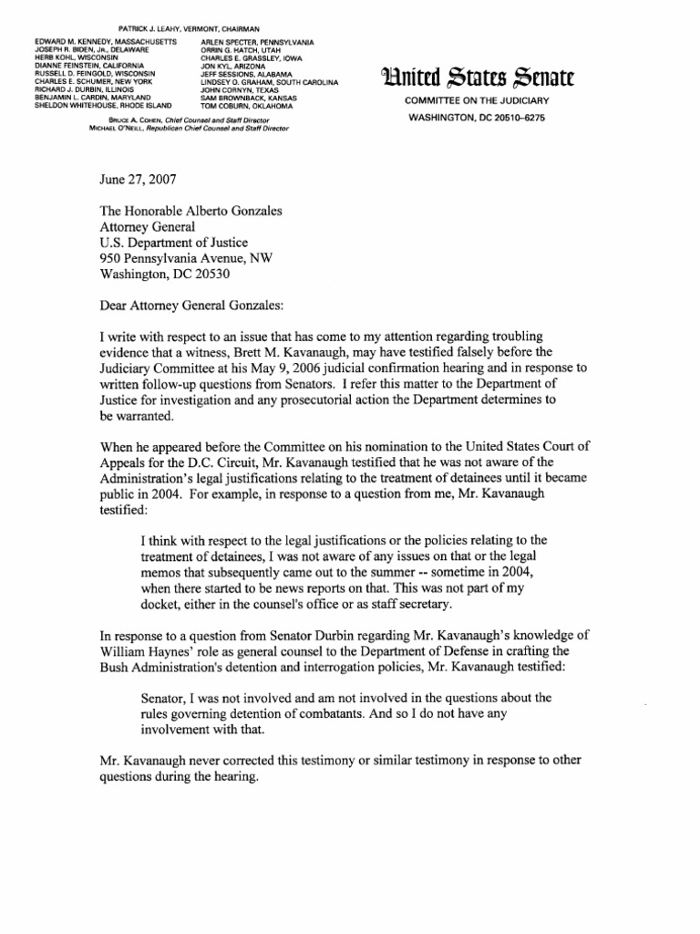 I write with respect to an issue that has come to my attention regarding troublingevidence that a witness, Brett M. Kavanaugh, may have testified falsely before theJudiciary Committee at his May 9, 2006 judicial confirmation hearing and in response towritten follow-up questions from Senators. I refer this matter to the Department of Justice for investigation and any prosecutorial action the Department determines tobe warranted.When he appeared before the Committee on his nomination to the United States Court of Appeals for the D.C. Circuit, Mr. Kavanaugh testified that he was not aware of theAdministration's legal justifications relating to the treatment of detainees until it becamepublic in 2004. For example, in response to a question from me, Mr. Kavanaughtestified:I think with respect to the legal justifications or the policies relating to thetreatment of detainees, I was not aware of any issues on that or the legalmemos that subsequently came out to the summer -- sometime in 2004,when there started to be news reports on that. This was not part of mydocket, either in the counsel's office or as staff secretary.In response to a question from Senator Durbin regarding Mr. Kavanaugh's knowledge of William Haynes' role as general counsel to the Department of Defense in crafting theBush Administration's detention and interrogation policies, Mr. Kavanaugh testified:Senator, I was not involved and am not involved in the questions about therules governing detention of combatants. And so I do not have anyinvolvement with that.Mr. Kavanaugh never corrected this testimony or similar testimony in response to otherquestions during the hearing.