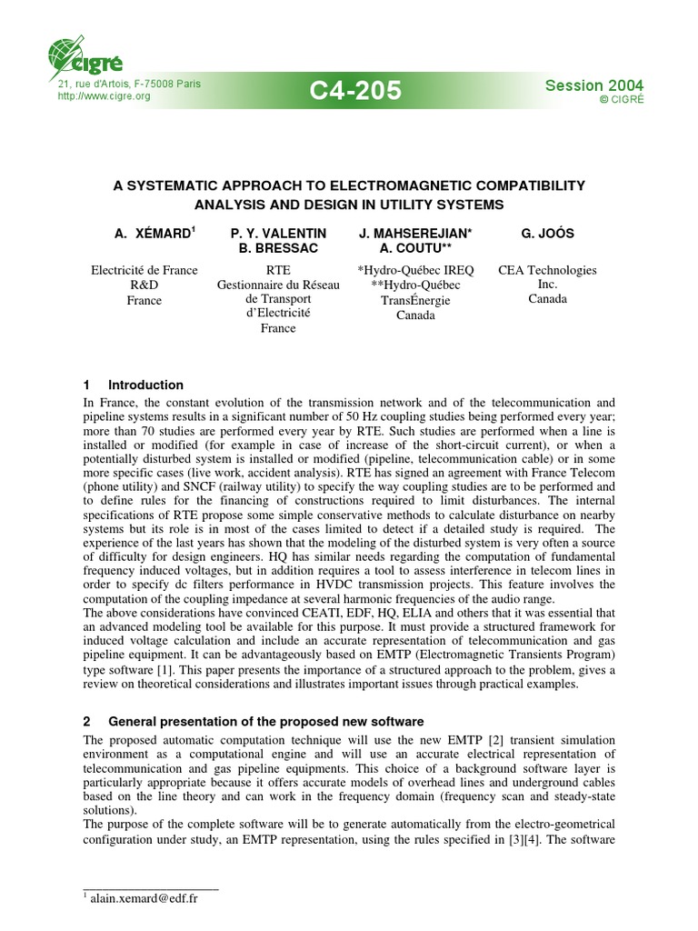 A. XMARD1 Electricit de France R&D France P. Y. VALENTIN B. BRESSAC RTE Gestionnaire du Rseau de Transport dElectricit France J. MAHSEREJIAN* A. COUTU** *Hydro-Qubec IREQ **Hydro-Qubec Transnergie Canada G. JOS CEA Technologies Inc. Canada
