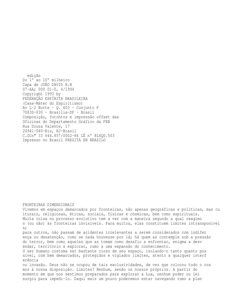 N 07-AA; 000 01-0, 4/1994 Copyright 1993 by FEDERAO ESPRITA BRASILEIRA (Casa-Mter do Espiritismo) Av L-2 Norte - Q. 603 - Conjunto F 70830-030 - Braslia-DF - Brasil Composio, fotohtos e impresso offset das Oficinas do Departamento Grfico da FEB Rua Souza Valente, 17 20941-040-Rio, RJ-Brasil C.GCn" 33 644.857/0002-84 L n 8L6Q0.503 Impresso no Brasil PRESITA EN BRAZILO