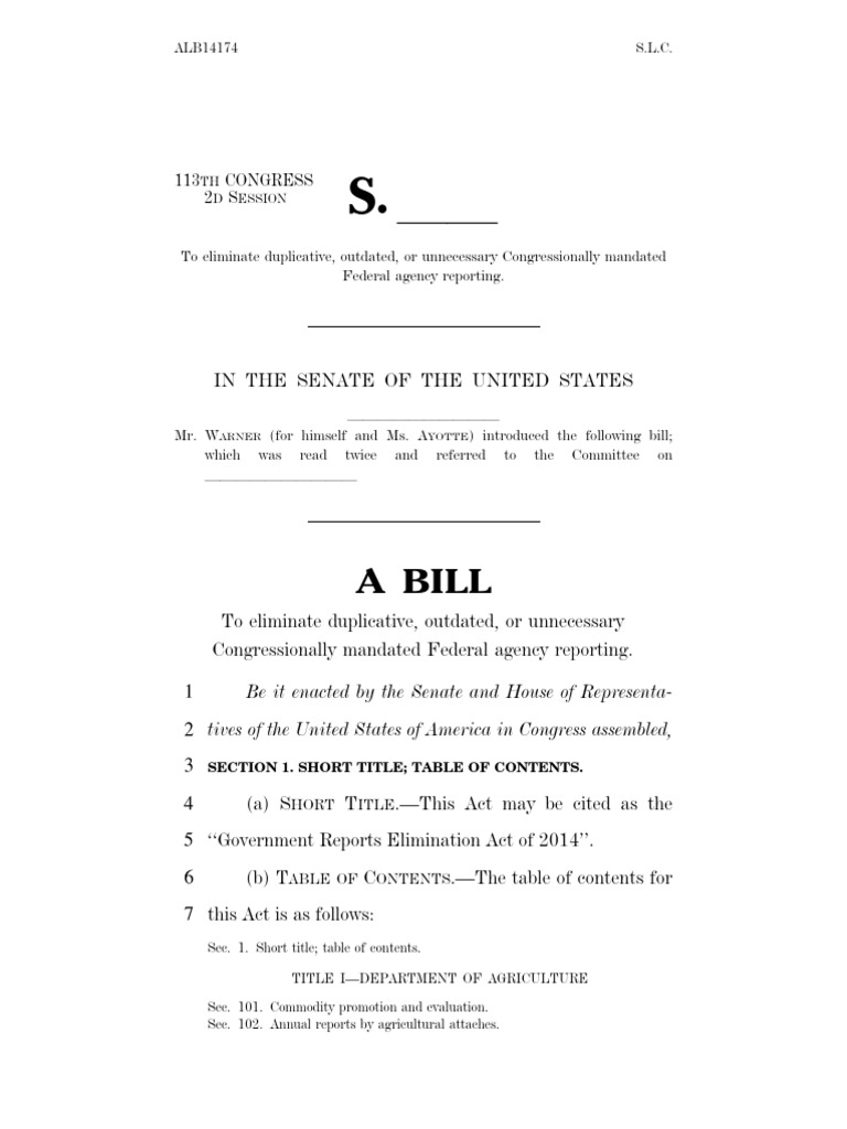 ALB14174 S.L.C. Sec.103.Reporting requirement under Farmland Protection Policy Act. Sec.104.Rural development programs. Sec.105.Access to broadband telecommunications services in rural areas. Sec.106.Promotion of agricultural exports to emerging democracies. Sec.107.Commodity Credit Corporation quarterly report to Congress. Sec.108.Crop insurance. Sec.109.Early child nutrition education evaluations and reports. Sec.110.Grain Inspection Service annual report. Sec.111.Notification prior to release of information. Sec.112.Plant pest and disease management and disaster prevention. Sec.113.Agricultural trade. Sec.114.Report on conservation program enrollments and assistance. Sec.115.Status report for Food for Progress program. Sec.116.Status report for technical assistance for specialty crops. Sec.117.Timber supply and demand in southeastern Alaska. Sec.118.Tongass National Forest report. TITLE II—DEPARTMENT OF COMMERCE Sec.201.Repeal of requirement for annual report on Atlantic migratory spe-cies. Sec.202.Repeal of requirement for annual report on progress by educational institutions to become designated as sea grant colleges or sea grant institutions. Sec.203.Repeal of requirement for annual reports on coordination between NSF and oceans and coastal research activities of NOAA. Sec.204.Repeal of requirement for annual report on donations by NIST of educationally useful Federal equipment to schools. Sec.205.Repeal of requirement for annual report by NIST on enterprise inte-gration standardization and implementation activities. Sec.206.Repeal of requirement for annual report on equal access for minority and economically disadvantaged students to fellowships on ocean, coastal, and Great Lakes resources. Sec.207.Repeal of requirement for annual report on activities of Technology Innovation Program. Sec.208.Repeal of requirement for annual report by TIP Advisory Board. Sec.209.Repeal of requirement for annual report on activities of West Atlantic Fisheries Organization. Sec.210.Harmful algal blooms and hypoxia reports. TITLE III—DEPARTMENT OF DEFENSE Sec.301.Report on administration and oversight of Armed Forces Retirement Home. Sec.302.Annual report on adequacy of budget for operational energy plans. Sec.303.Annual report on combatant command activities. Sec.304.Annual report on combating terrorism. Sec.305.Annual report on public-private competition. Sec.306.Arms Export Control Act report on military exports. Sec.307.Reports on protection of certain individuals. Sec.308.Audits of undefinitized contracts. Sec.309.Notification of award of certain contracts to entities controlled by a foreign government. Sec.310.Commercialization pilot program. Sec.311.Notification of certain leases of vehicles.