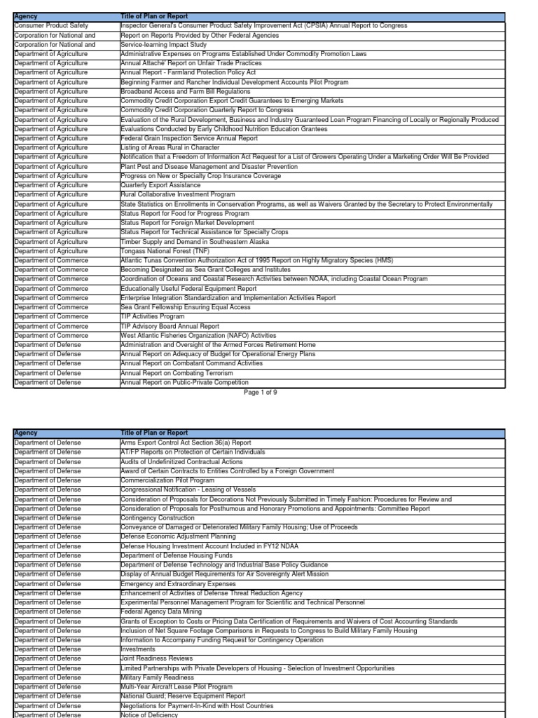 Department of DefenseReport on Centers of ExcellenceDepartment of DefenseReport on Congressional Notification on Decision Made to Carry out a Repair ProjectDepartment of DefenseReport on Meritorious Security WaiversDepartment of DefenseReport on Reliability of DoD Financial StatementsDepartment of DefenseReport to Congress Regarding Equip and Train Authority to Recover the Remains of Missing PersonnelDepartment of DefenseReporting Requirements Relating to Renewable Energy Use by DoD to Meet Department's Electricity NeedsDepartment of DefenseReports on Transfers from High-Priority Readiness AppropriationsDepartment of DefenseRequirement for Advance Notification to Congress of Transfer of Certain Excess Defense ArticlesDepartment of DefenseRequirement for Annual Program GoalsDepartment of DefenseSale of Electricity from Alternate Energy and Cogeneration Production FacilitiesDepartment of DefenseSavings Resulting from Workforce Reductions as Part of Conversion of FunctionsDepartment of DefenseSpace Protection StrategyDepartment of DefenseTimeliness Standards for Disposition of Applications Before Correction BoardsDepartment of DefenseWater Conservation at Military InstallationsDepartment of EducationAllocation and Justification of Training Program Funds by Professional Discipline and Other Program AreasDepartment of EducationData Collection on the Distribution of Federal Funds. Report ontains 2 years of data on all State-Administered Formula Programs that Department of EducationReport Documenting the Performance of all TRIO programs.Department of EducationReport on Activities Carried out under the Rehabilitation ActDepartment of EducationReport on AP Course and Test Participation and Outcomes (Incentive Grants).Department of EducationReport on AP Course and Test Participation and Outcomes (Test Fees).Department of EducationReport on Impact Aid Construction Justifying Discretionary Grant Awards.Department of EducationReport on the Activities and Services Undertaken with Funds Provided under the Protection and Advocacy of Individual Rights Department of EducationReport on the Rural and Low-Income School (RLIS) Program.Department of EducationReport Regarding the Activities Assisted under the GEAR UP Program and the Evaluations Conducted Pursuant to this Section.Department of EnergyAnnual Report on Enforcement Actions for Stripper Well and Exxon Funds.Department of EnergyAnnual Report on Study of Economic Dispatch (ESCS 3096) - - Economic Dispatch and Variable Generation ResourcesDepartment of EnergyAnnual Update Workforce Restructuring Plans for Defense Nuclear Facilities - - Annual Report on Contractor Workforce Restructuring Department of EnergyBiennial Progress Report: Meeting Federal Government Goals for the Consumption of Renewable Energy.Department of EnergyBiennial Report, on Advanced Concepts and Technologies to Maximize U.S. Geothermal Resource Potential. - Report to Congress, Department of EnergyBiennial Report, on Award of H-Prize for Advancements in Hydrogen Production Storage Distribution and Utilization.Department of EnergyPhased Reports on Evaluation of the Success of Voluntary Commitments to Reduce Industrial Energy Intensity.Department of EnergyQuinquennial Report, on the Technical and Economic Viability of Marine and Hydrokinetic Energy Technologies, (with interim Department of EnergyReport on DOE's Experience with the Science and Engineering Education Pilot Program under section 983, and if Determined Department of EnergyReport on the Activities of the Petroleum Reserves Office for a Strategic Unconventional Fuels Development ProgramDepartment of EnergySemi-annual Progress Report, on Compliance with Requirements of Section 305(b) to Amend Standards for Industrial Equipment. - Department of Health and Human Annual Long-Term Care Ombudsman Program Report to the CongressDepartment of Health and Human Annual Report on Part D Formularies' Inclusion of Drugs Commonly Used by Dual EligiblesDepartment of Health and Human Annual Report on Pediatric InitiativeDepartment of Health and Human Annual Report on the C.W. Bill Young Cell Transplantation ProgramPage 3 of 9