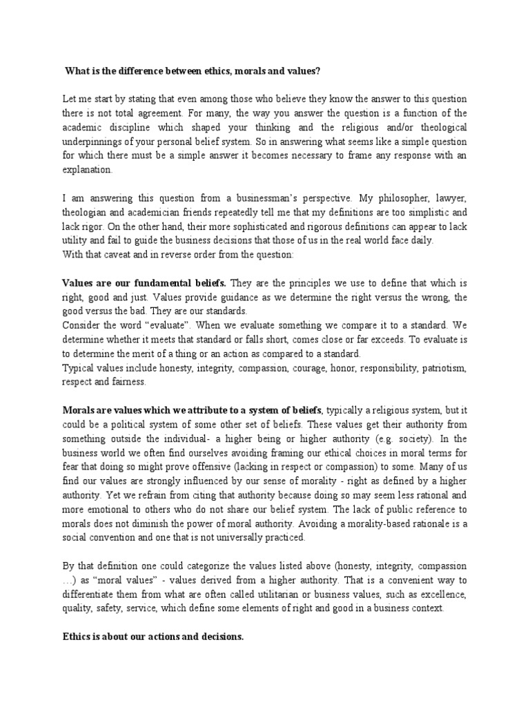 Let me start by stating that even among those who believe they know the answer to this question there is not total agreement. For many, the way you answer the question is a function of the academic discipline which shaped your thinking and the religious and/or theological underpinnings of your personal belief system. So in answering what seems like a simple question for which there must be a simple answer it becomes necessary to frame any response with an explanation. am answering this question from a businessman!s perspective. "y philosopher, lawyer, theologian and academician friends repeatedly tell me that my definitions are too simplistic and lack rigor. #n the other hand, their more sophisticated and rigorous definitions can appear to lack utility and fail to guide the business decisions that those of us in the real world face daily. $ith that caveat and in reverse order from the question% Values are our fundamental beliefs. &hey are the principles we use to define that which is right, good and 'ust. (alues provide guidance as we determine the right versus the wrong, the good versus the bad. &hey are our standards. )onsider the word *evaluate+. $hen we evaluate something we compare it to a standard. $e determine whether it meets that standard or falls short, comes close or far exceeds. &o evaluate is to determine the merit of a thing or an action as compared to a standard. &ypical values include honesty, integrity, compassion, courage, honor, responsibility, patriotism, respect and fairness. Morals are values which we attribute to a system of beliefs , typically a religious system, but it could be a political system of some other set of beliefs. &hese values get their authority from something outside the individual, a higher being or higher authority -e.g. society.. n the business world we often find ourselves avoiding framing our ethical choices in moral terms for fear that doing so might prove offensive -lacking in respect or compassion. to some. "any of us find our values are strongly influenced by our sense of morality , right as defined by a higher authority. /et we refrain from citing that authority because doing so may seem less rational and more emotional to others who do not share our belief system. &he lack of public reference to morals does not diminish the power of moral authority. 0voiding a morality,based rationale is a social convention and one that is not universally practiced. 1y that definition one could categori2e the values listed above -honesty, integrity, compassion 3. as *moral values+ , values derived from a higher authority. &hat is a convenient way to differentiate them from what are often called utilitarian or business values, such as excellence, quality, safety, service, which define some elements of right and good in a business context. Ethics is about our actions and decisions.
