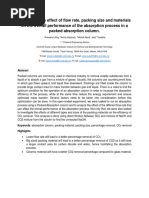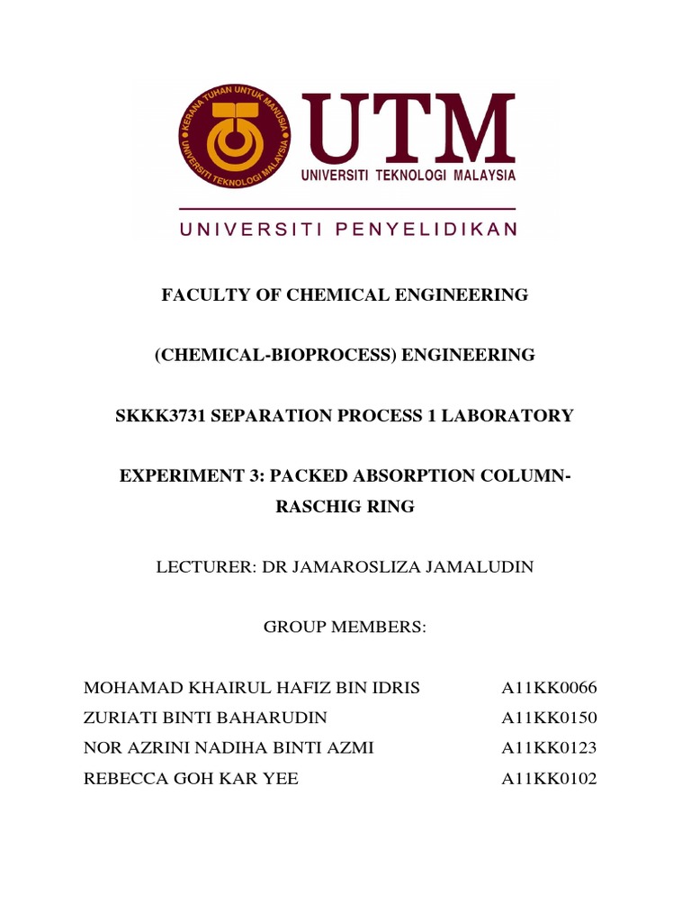 LITERATURE REVIEW Absorption is a physical or chemical phenomenon or a process in which atoms, molecules, or ions enter some bulk phase gas, liquid, or solid material. Absorption is a condition in which something takes in another substance. It is one of the separation techniques that involved gas and liquid. One or more components in gas mixture can be separated when a certain liquid is flowing through it in cross-flow or counter-currently. The liquid will absorb the component and mass transfer will take place to separate the component from gas mixture. The efficiency of packed column is expressed as the height of transfer unit. Inside a packed absorption column, there are packing materials. The packing materials are used to increase the contact surface area for the absorption process so that the process will become more efficient and take shorter time. There are many type of packing materials in packed absorption column such as raschig ring and intalox saddle. In this experiment, the packing materials used are raschig ring. The Raschig Ring is a cylinder of equal length and diameter used as tower packing in many chemical processes and mass transfer applications. They are usually made of ceramic or metal. Raschig rings are named after their inventor, the German chemist Friedrich Raschig. Before the invention of the tower packing shape by Friedrich Raschig, packed columns were filled with quartz, broken glass bottles, broken pieces of pottery, or coke. Operating data obtained from one tower could not be used in a second tower as the packing material was not [Link] invention of the Raschig Ring gave the packed column consistency and dependability. Raschig Rings significantly improved the operating characteristics of the column. Due to the low cost, raschig rings are widely used.