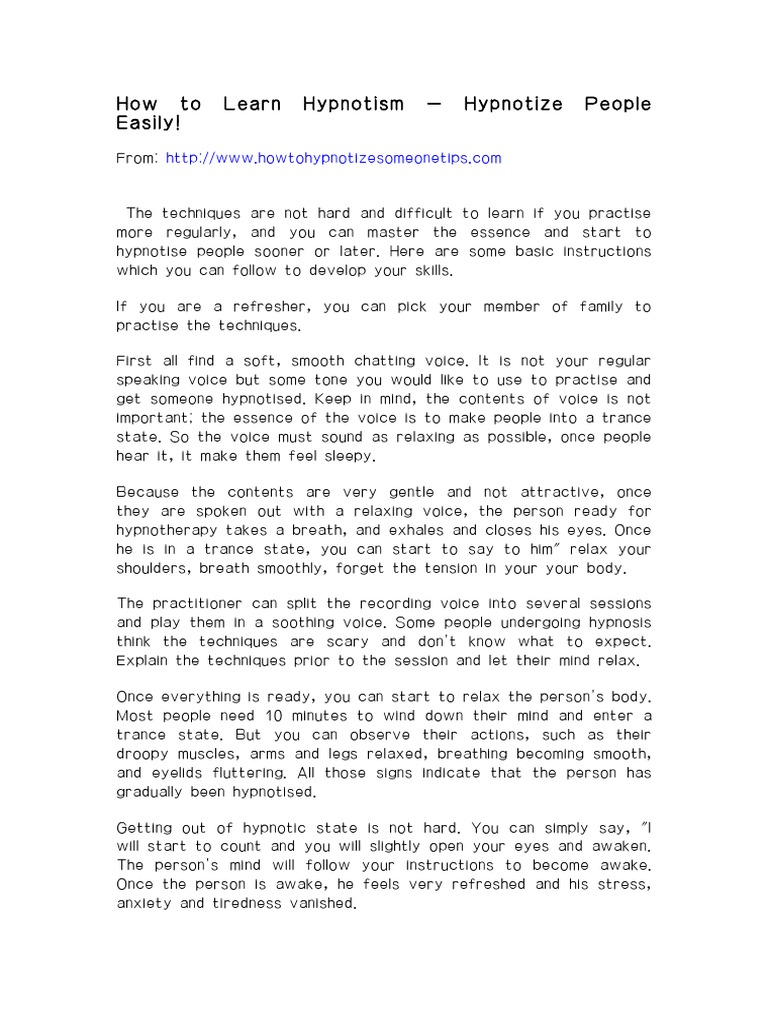 The techniques are not hard and di icult to learn i you practise more re!ularly" and you can master the essence and start to hypnotise people sooner or later. Here are some #asic instructions which you can ollow to de$elop your s%ills. & you are a re resher" you can pic% your mem#er o practise the techniques. amily to