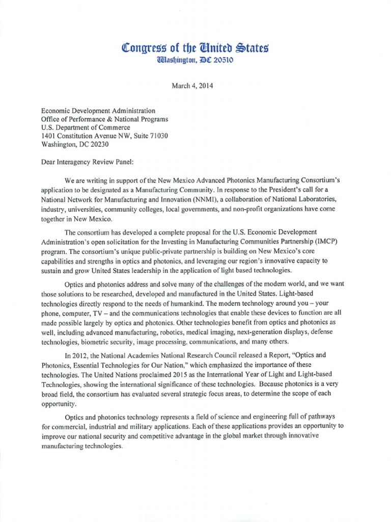 Sens. Tom Udall and Martin Heinrich, along with U.S. Reps. Steve Pearce, Ben Ray Lujan, and Michelle Lujan Grisham write a letter of support for the New Mexico Advanced Photonics Manufacturing Consortium's application to be designated as a Manufacturing Community.
