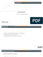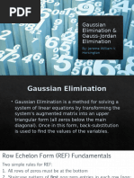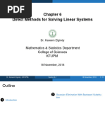 The usefulness of Gaussian elimination with backsubstitution is primarily pedagogical. It stands between full elimination schemes such as Gauss-Jordan, and triangular decomposition schemes such as will be discussed in the next section. Gaussian elimination reduces a matrix not all the way to the identity matrix, but only halfway, to a matrix whose components on the diagonal and above (say) remain nontrivial. Let us now see what advantages accrue. Suppose that in doing Gauss-Jordan elimination, as described in 2.1, we at each stage subtract away rows only below the then-current pivot element. When a 22 is the pivot element, for example, we divide the second row by its value (as before), but now use the pivot row to zero only a 32 and a42 , not a12 (see equation 2.1.1). Suppose, also, that we do only partial pivoting, never interchanging columns, so that the order of the unknowns never needs to be modied. Then, when we have done this for all the pivots, we will be left with a reduced equation that looks like this (in the case of a single right-hand side vector): a11 a12 a13 a14 x1 b1 0 a22 a23 a24 x2 b2 (2.2.1) = 0 0 a33 a34 x3 b3 0 0 0 a44 x4 b4 Here the primes signify that the as and bs do not have their original numerical values, but have been modied by all the row operations in the elimination to this point. The procedure up to this point is termed Gaussian elimination.