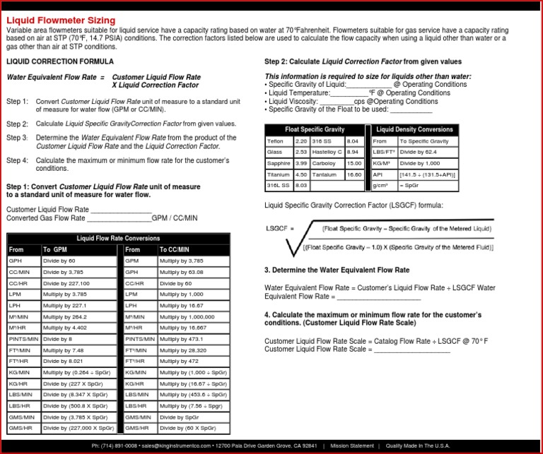 Variable area flowmeters suitable for liquid service have a capacity rating based on water at 70Fahrenheit. Flowmeters suitable for gas service have a capacity rating based on air at STP (70F, 14.7 PSIA) conditions. The correction factors listed below are used to calculate the flow capacity when using a liquid other than water or a gas other than air at STP conditions. LIQUID CORRECTION FORMULA Water Equivalent Flow Rate = Customer Liquid Flow Rate X Liquid Correction Factor Step 2: Calculate Liquid Correction Factor from given values This information is required to size for liquids other than water: Specific Gravity of Liquid:____________ @ Operating Conditions Liquid Temperature:__________F @ Operating Conditions Liquid Viscosity: _________cps @Operating Conditions Specific Gravity of the Float to be used: ___________
