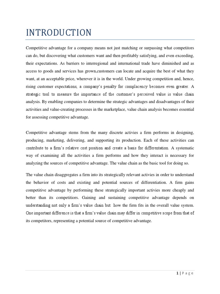 Competitive advantage for a company means not just matching or surpassing what competitors can do, but discovering what customers want and then profitably satisfying, and even exceeding, their expectations. As barriers to interregional and international trade have diminished and as access to goods and services has grown,customers can locate and acquire the best of what they want, at an acceptable price, wherever it is in the world. Under growing competition and, hence, rising customer expectations, a companys penalty for complacency becomes even greater. A strategic tool to measure the importance of the customers perceived value is value chain analysis. By enabling companies to determine the strategic advantages and disadvantages of their activities and value-creating processes in the marketplace, value chain analysis becomes essential for assessing competitive advantage.