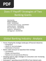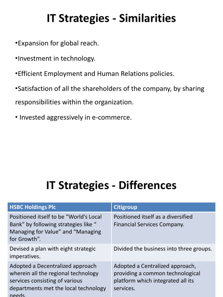 HSBC Holdings Plc Positioned itself to be Worlds Local Bank by following strategies like Managing for Value and Managing for Growth. Devised a plan with eight strategic imperatives. Adopted a Decentralized approach wherein all the regional technology services consisting of various departments met the local technology needs. Citigroup Positioned itself as a diversified Financial Services Company.
