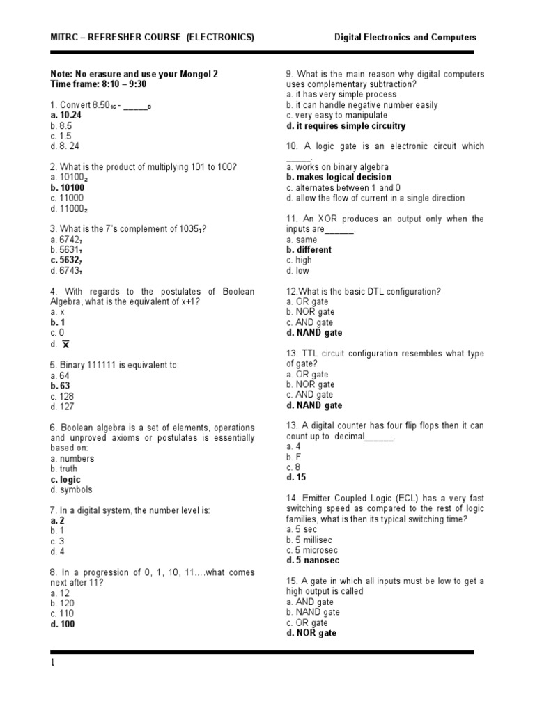 0. What is the main reason )h di!ital computers uses complementar subtraction" a. it has ver simple process b. it can handle ne!ative number easil c. ver eas to manipulate d+ it re2!ires sim le circ!itr# 10. ' lo!ic !ate is an electronic circuit )hich _____. a. )or1s on binar al!ebra -+ ma3es logical decision c. alternates bet)een 1 and 0 d. allo) the flo) of current in a sin!le direction 11. 'n 234 produces an output onl inputs are______. a. same -+ di%%erent c. hi!h d. lo) [Link] is the basic 567 confi!uration" a. 34 !ate b. 834 !ate c. '85 !ate d+ N4ND gate 1#. 667 circuit confi!uration resembles )hat t pe of !ate" a. 34 !ate b. 834 !ate c. '85 !ate d+ N4ND gate 1#. ' di!ital counter has four flip flops then it can count up to decimal______. a. 4 b. 9 c. 8 d+ '. 14. :mitter Coupled 7o!ic ;:C7< has a ver fast s)itchin! speed as compared to the rest of lo!ic families( )hat is then its t pical s)itchin! time" a. 5 sec b. 5 millisec c. 5 microsec d+ . nanosec 15. ' !ate in )hich all inputs must be lo) to !et a hi!h output is called a. '85 !ate b. 8'85 !ate c. 34 !ate d+ NOR gate )hen the