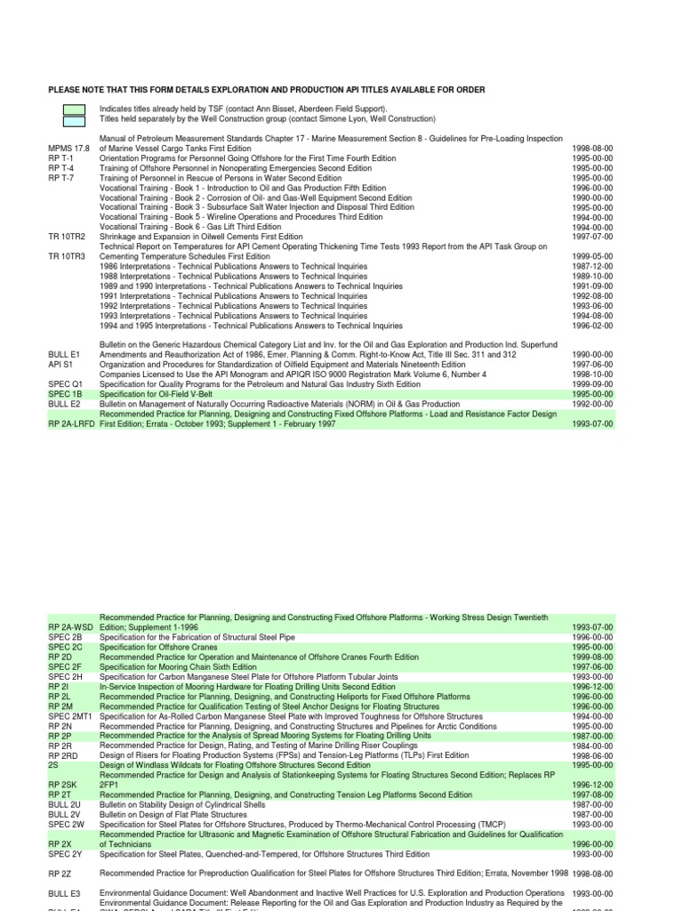 titles already held by TSF (contact Ann Bisset, Aberdeen Field Support). Titles held separately by the Well Construction group (contact Simone Lyon, Well Construction) Manual of Petroleum Measurement Standards Chapter 17 - Marine Measurement Section 8 - Guidelines for Pre-Loading Inspection of Marine Vessel Cargo Tanks First Edition Orientation Programs for Personnel Going Offshore for the First Time Fourth Edition Training of Offshore Personnel in Nonoperating Emergencies Second Edition Training of Personnel in Rescue of Persons in Water Second Edition Vocational Training - Book 1 - Introduction to Oil and Gas Production Fifth Edition Vocational Training - Book 2 - Corrosion of Oil- and Gas-Well Equipment Second Edition Vocational Training - Book 3 - Subsurface Salt Water Injection and Disposal Third Edition Vocational Training - Book 5 - Wireline Operations and Procedures Third Edition Vocational Training - Book 6 - Gas Lift Third Edition Shrinkage and Expansion in Oilwell Cements First Edition Technical Report on Temperatures for API Cement Operating Thickening Time Tests 1993 Report from the API Task Group on Cementing Temperature Schedules First Edition 1986 Interpretations - Technical Publications Answers to Technical Inquiries 1988 Interpretations - Technical Publications Answers to Technical Inquiries 1989 and 1990 Interpretations - Technical Publications Answers to Technical Inquiries 1991 Interpretations - Technical Publications Answers to Technical Inquiries 1992 Interpretations - Technical Publications Answers to Technical Inquiries 1993 Interpretations - Technical Publications Answers to Technical Inquiries 1994 and 1995 Interpretations - Technical Publications Answers to Technical Inquiries