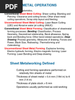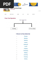 Corner Radius - Outside radius. Counterboring - Machining or coining operation to generate a cylindrical flat-bottomed hole. Countersinking - Machining or coining operation to generate a conical angle on a hole. Crimping - The forming of relatively small corrugations in order to set down and lock a seam, to create an arc in a strip of metal, or to reduce an existing arc or diameter. Deburr - To remove the sharp, knife-like edge from parts. Dedicated Tooling - Commonly referred to as "hard tooling"-- tooling made to produce a specific part. Deep drawing - Characterized by the production of a parallel-wall cup from a flat blank of sheet metal. The blank may be circular, rectangular, or a more complex shape. The blank is drawn into the die cavity by the action of a punch. The drawing of deeply recessed parts from sheet material through plastic flow of the material when, the depth of the recess equals or exceeds the minimum part width. Die - Tool with a void or cavity which is precisely fitted to a "Punch" used to shear or form sheet metal parts. Die Clearance - Amount of space between the punch and die opening. Die Marks - Scratches, scrub marks, indentations, galling or burnishing of sheet metal work pieces by tooling. Die stamping - The general term for a sheet metal part that is formed, shaped, or cut by a die in a press in one or more operations. Draw die - A specific type of form die that basically involves forcing the flat sheet of metal into a die cavity with a punch while holding the work piece around the cavity to control metal flow. Drawing - (1) Engineering document depicting a part or assembly. (2) In metal forming, the stretching or compressing of a sheet metal part into a die by a punch to create a 3-dimensional part. Ductility - Ability of a material to be bent or otherwise formed without fracture. Edging - (1) In sheet metal forming, reducing the flange radius by retracting the forming punch a small amount after the stroke but before release of the pressure. (2) In rolling, the working of metal in which the axis of the roll is parallel to the thickness dimension. Also called edge rolling. Embossing - A process for producing raised or sunken designs in sheet material by means of male and female dies, theoretically with no change in metal thickness. Heavy embossing and coining are similar operations. Extruding - (1) The turning up or drawing out of a flange around a hole which has been punched in a previous operation. Also called hole flanging. (2) The punching and flanging of a hole in one operation generating a slug. (3) The cutting or tearing (piercing) and flanging of a hole in one operation without generating a slug. Also called spearing or spear punching.