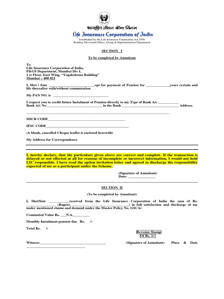 SECTION I To be completed by Annuitant To Life Insurance Corporation of India, P&GS Department, Mumbai Div I, 1 st Floor, East Wing, Yogakshema Building Mumbai 400 021 I, Shri / Smt. _________________________opt for payment of Pension for _____________years certain and life thereafter with/without commutation. My PAN NO. is ______________________________ I request you to credit future Instalment of Pension directly to my Type of Bank A/c ___________ Bank A/c No ______________________________ in the Bank _______________________________ Address ______________________________________________________________________________ MICR CODE__________________________________________ IFSC CODE_____________________________________________ (A blank, cancelled Cheque leaflet is enclosed herewith) My Address for Correspondence